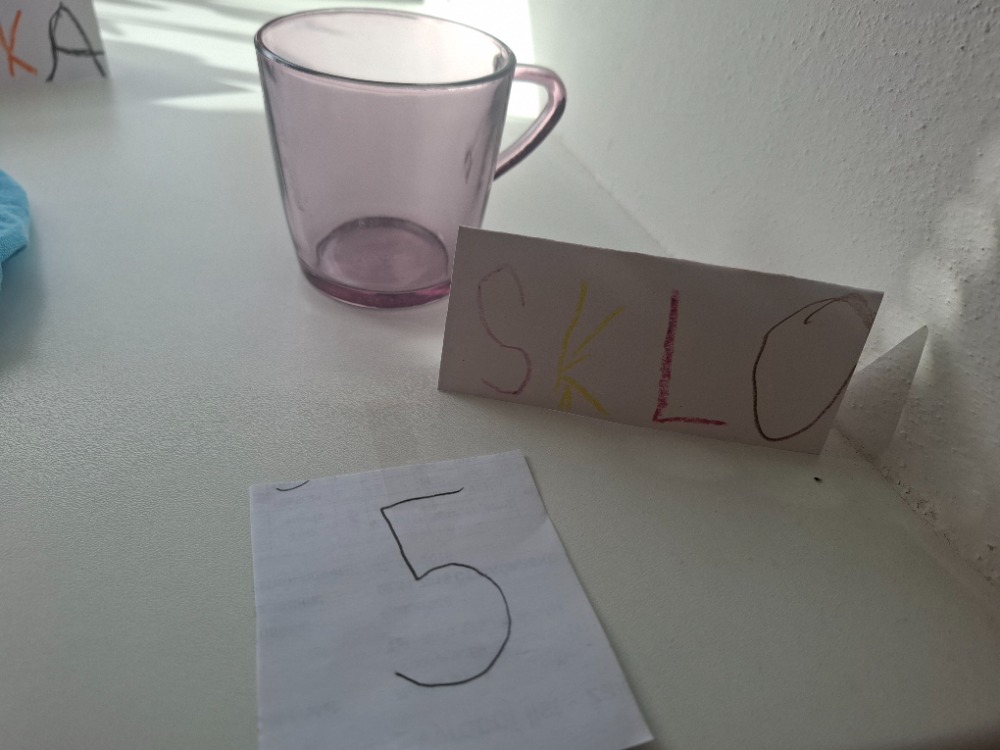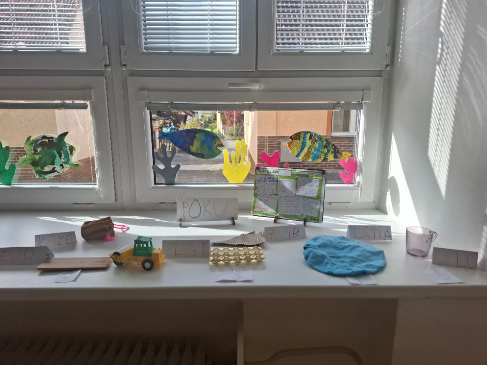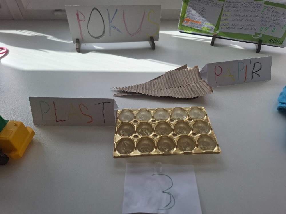 Když začalo pršet, začali jsme hledat předměty z různých materiálů – papír, dřevo, sklo, plast a kůže. Jakmile jsme je všechny nasbírali, napsali jsme k nim naše hypotézy a přistoupili k dalšímu kroku. A ejhle, přestalo pršet. Protože nám zrovna nepřálo počasí a nemohli jsme čekat, nanosili jsme všechny předměty do sprchy, kde jsme jim nechali dopadat vodu. A co víc, k tomu jsme si zpívali známou písničku „Prší, prší, jen se leje“, což dodalo celému pokusu ještě větší zábavu.