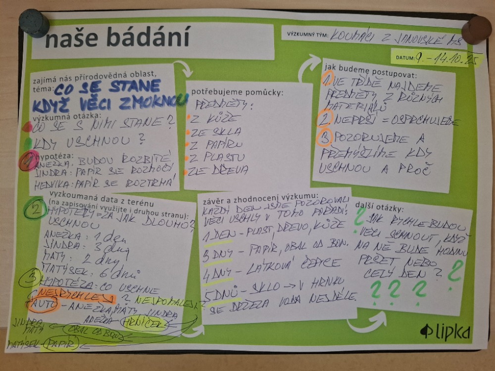 Na začátku jsme se sešli a začali přemýšlet, jaký výsledek bychom mohli očekávat. Paní ředitelka se stala hlavní zapisovatelkou našich hypotéz. Každé dítě mělo svůj nápad: Anežka si myslela, že když předměty zmoknou, budou rozbité, Jindra si byl jistý, že papír se rozmočí, a Hedvička naopak předpokládala, že se papír roztrhá. Bylo to napínavé!