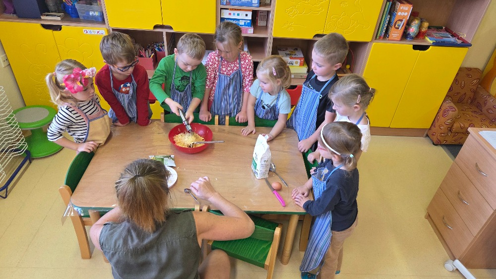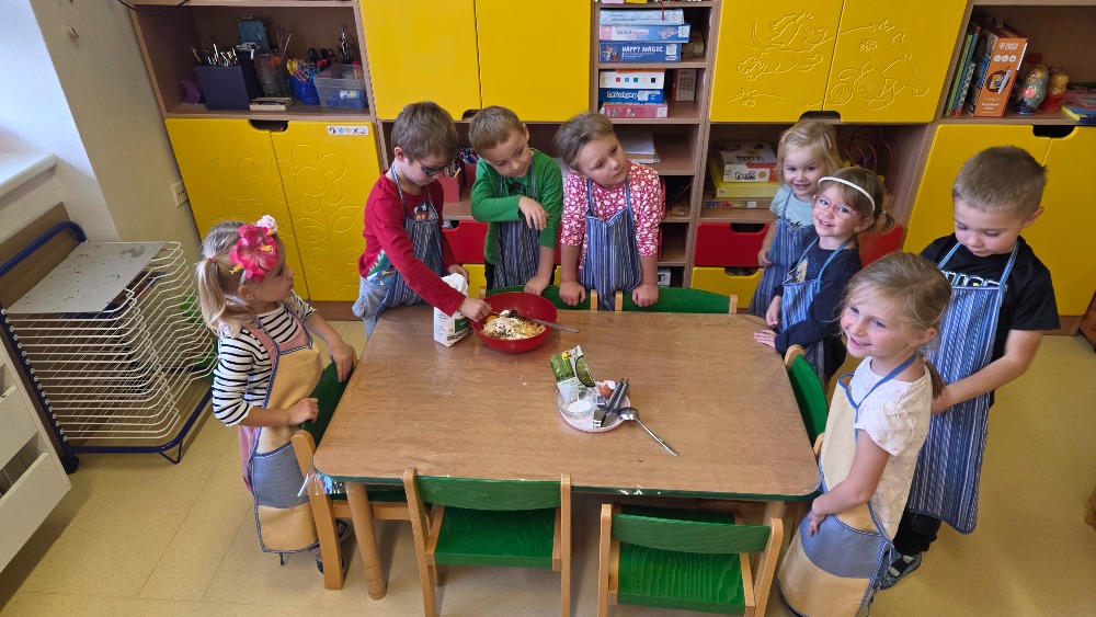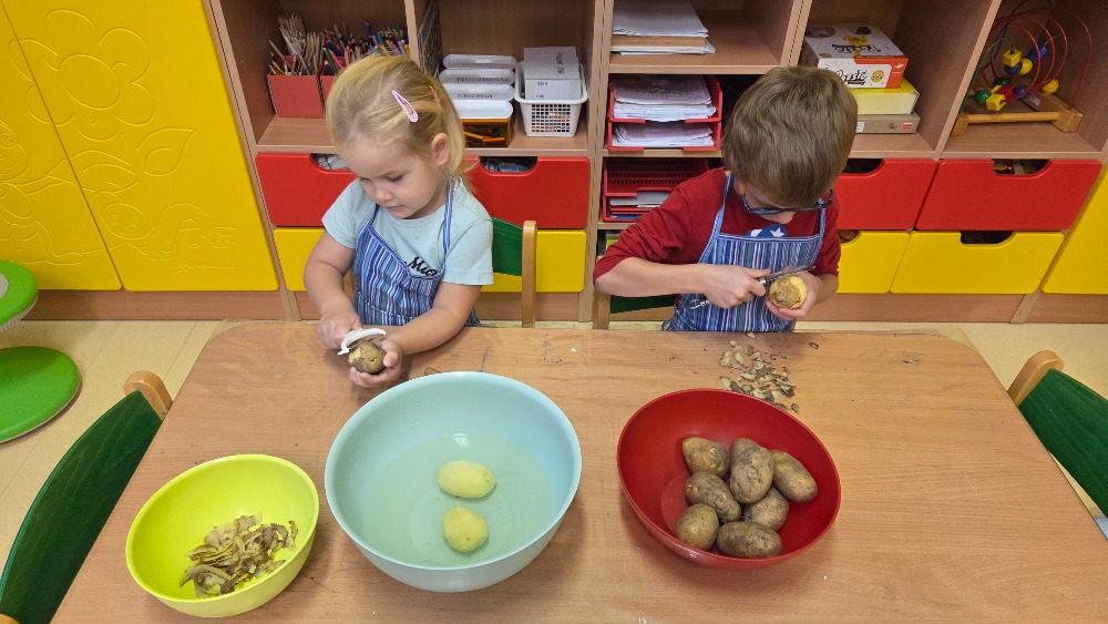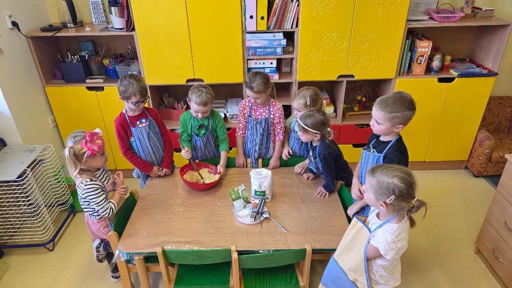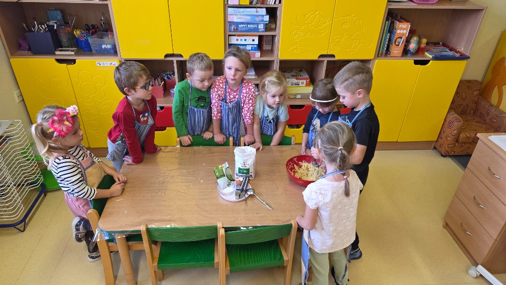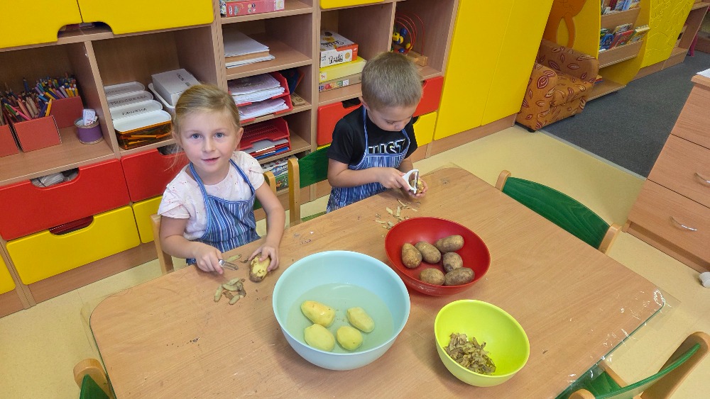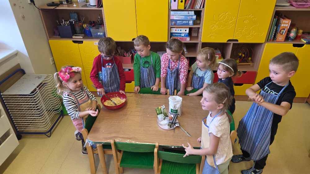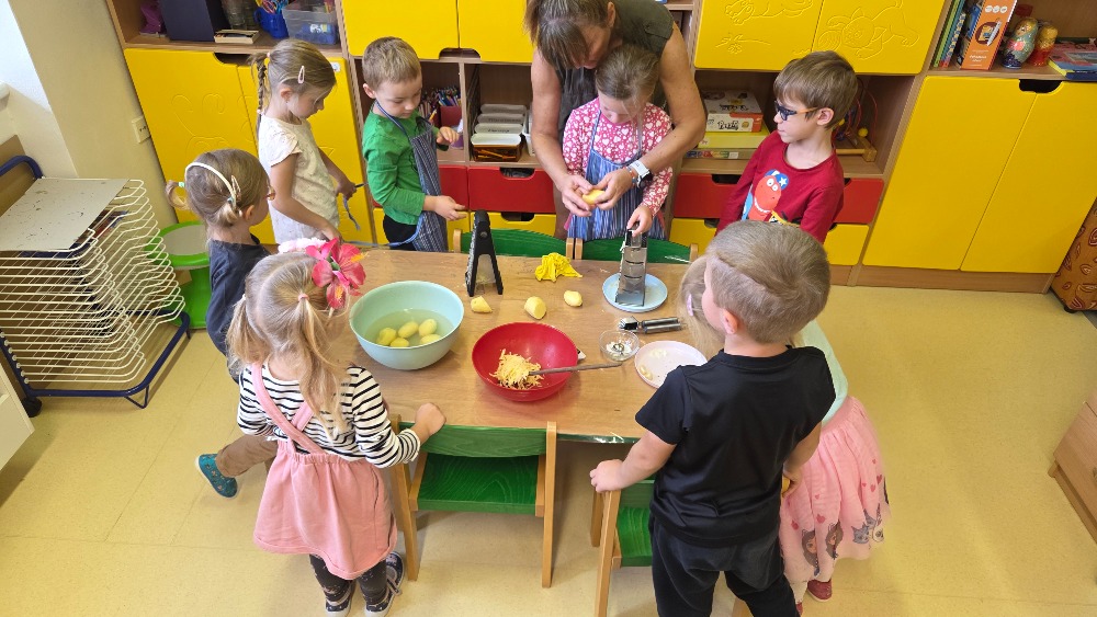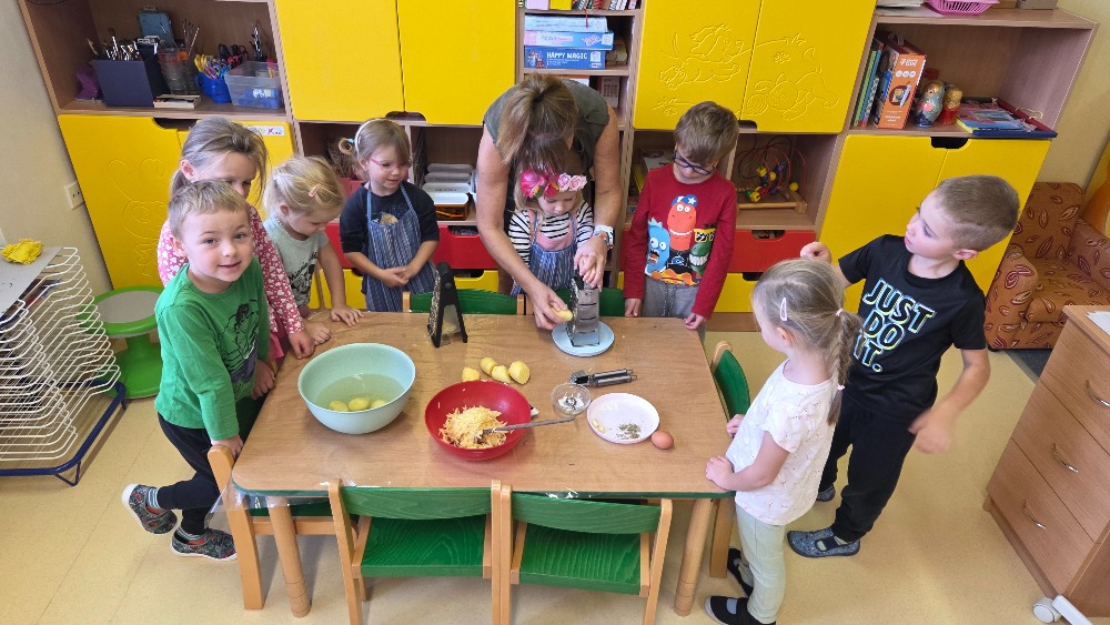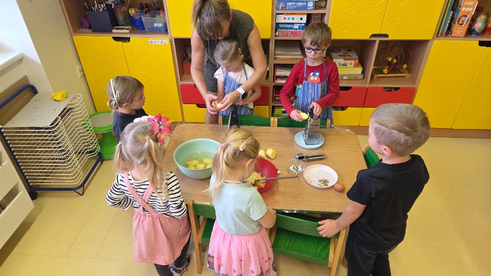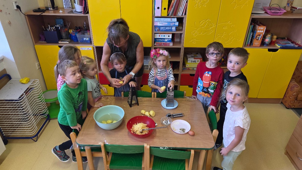 Bramborový týden jsme začali přípravou těsta na jednu z nejoblíbenějších pochoutek, bramboráku. Všichni jsme se tak stali malými kuchaříčky, kteří si přípravu zpříjemnili i říkankou Koulela se ze dvora, takhle velká brambora. Každý přiložil ruku k dílu, jak přípravou brambor, tak špetkou koření, mícháním a přípravou na plech. Ochutnávka těsta v syrovém stavu nemohla chybět. Na bramboráčky jsme se tak těšili, že někteří už nevydrželi čekat až nebudou horké a pustili se do nich způsobem ojedinělým :-D