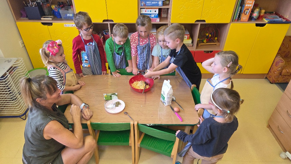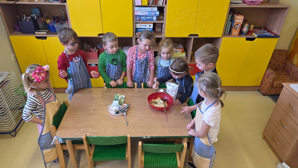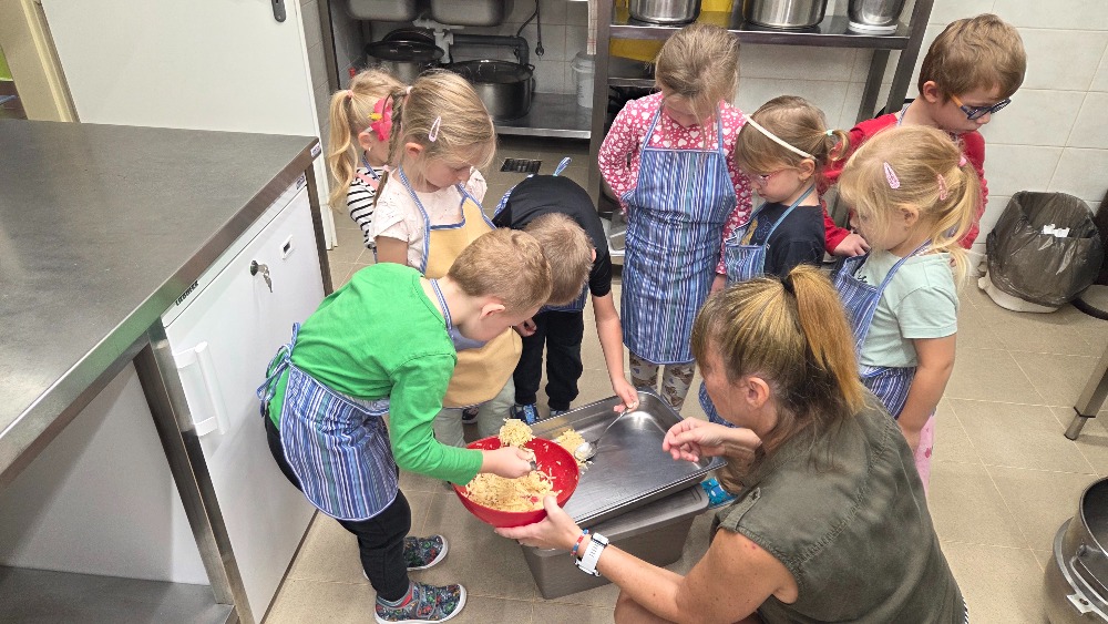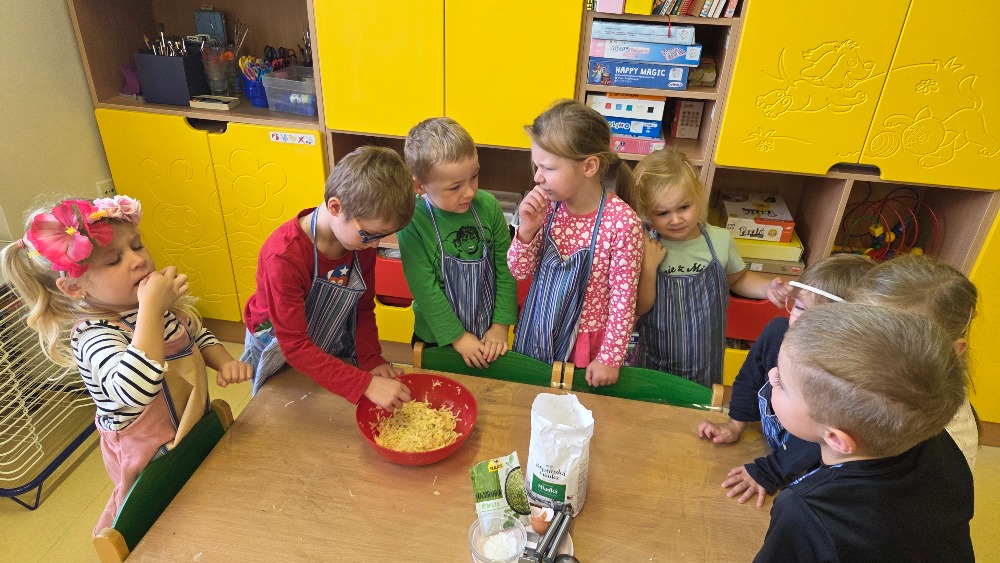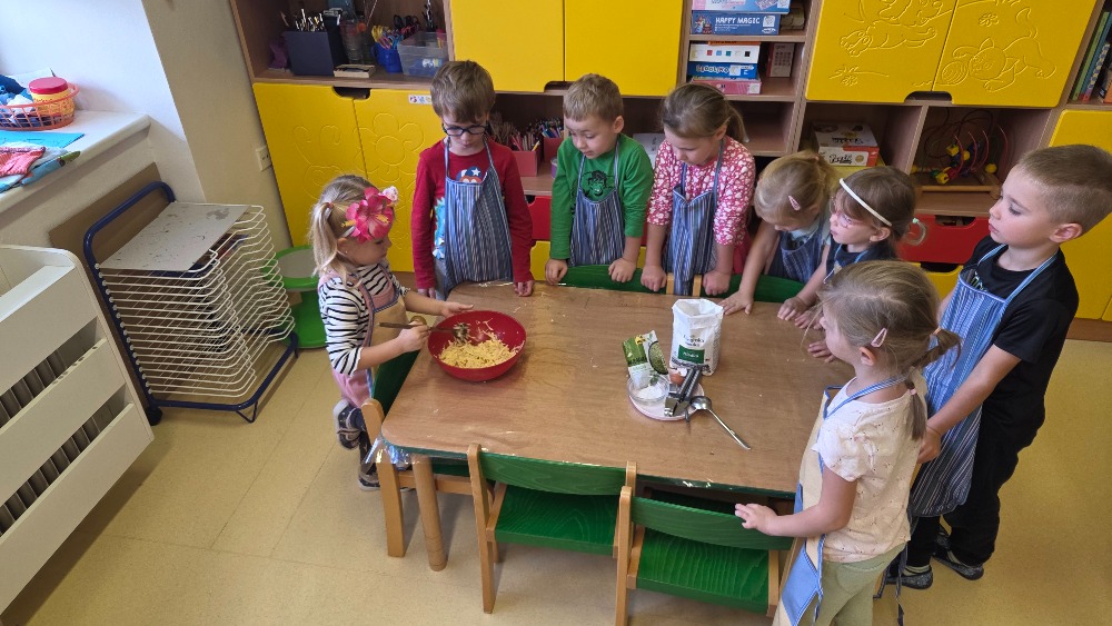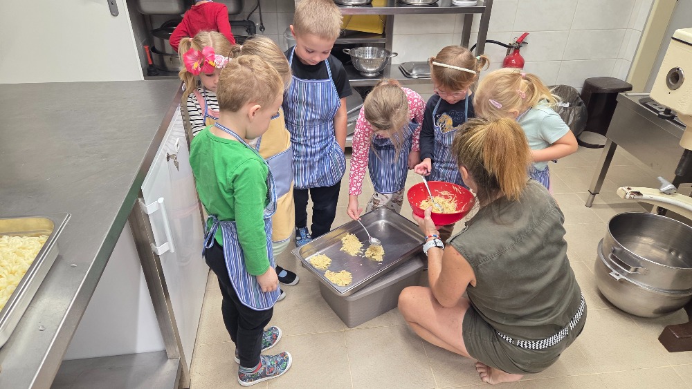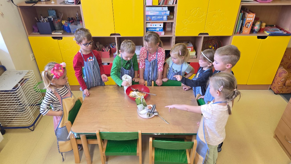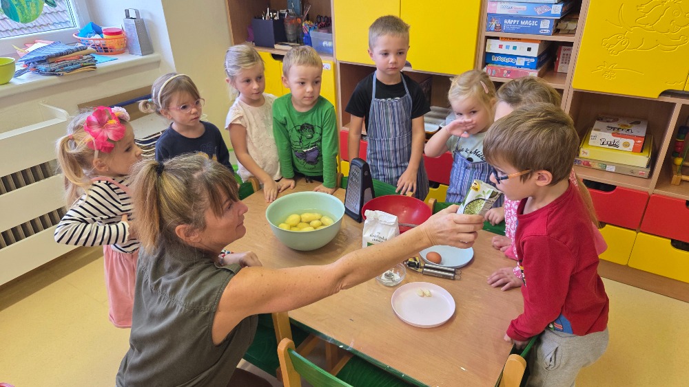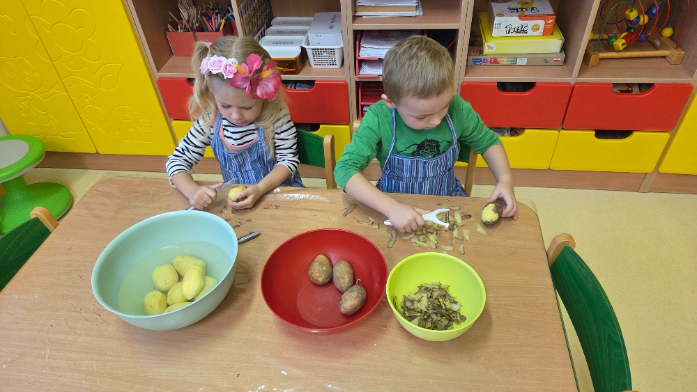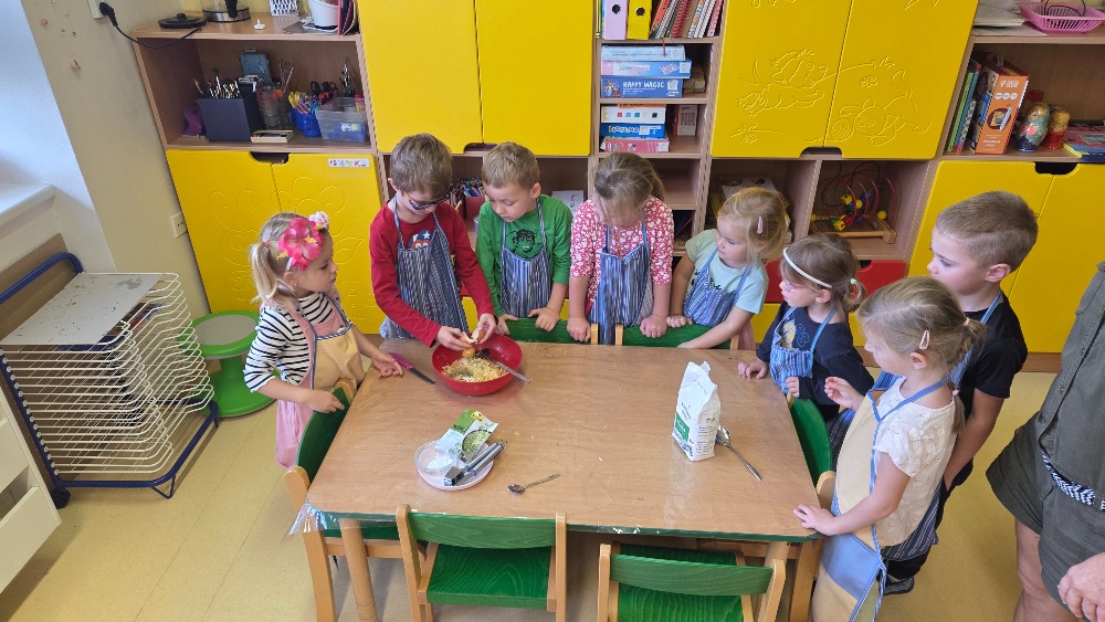 Bramborový týden jsme začali přípravou těsta na jednu z nejoblíbenějších pochoutek, bramboráku. Všichni jsme se tak stali malými kuchaříčky, kteří si přípravu zpříjemnili i říkankou Koulela se ze dvora, takhle velká brambora. Každý přiložil ruku k dílu, jak přípravou brambor, tak špetkou koření, mícháním a přípravou na plech. Ochutnávka těsta v syrovém stavu nemohla chybět. Na bramboráčky jsme se tak těšili, že někteří už nevydrželi čekat až nebudou horké a pustili se do nich způsobem ojedinělým :-D