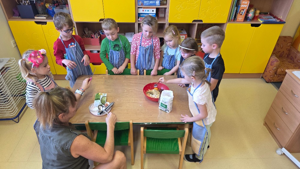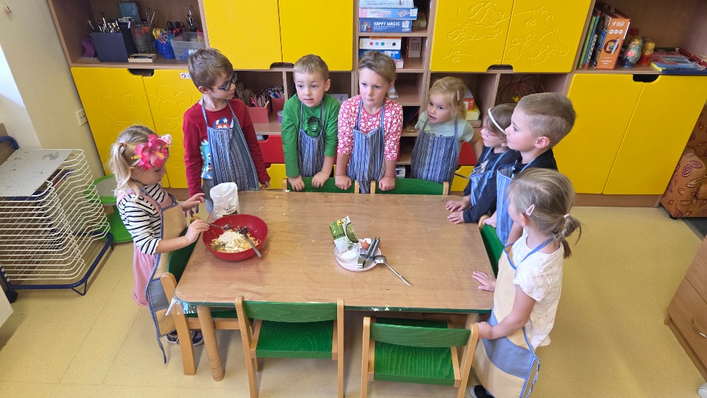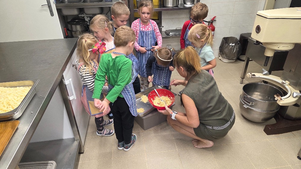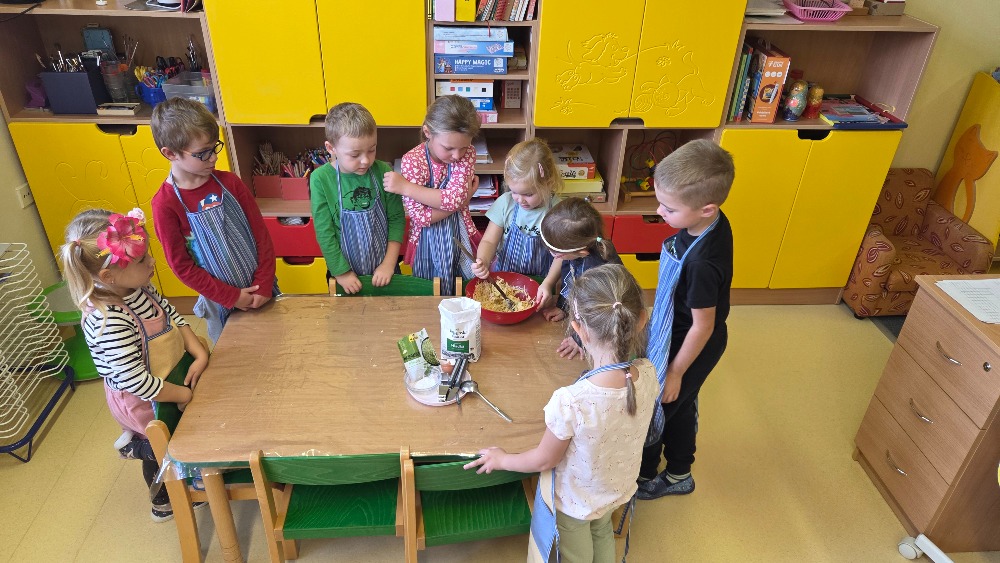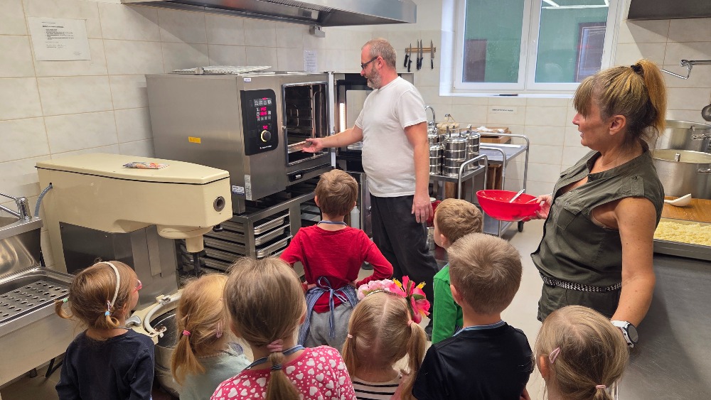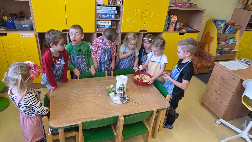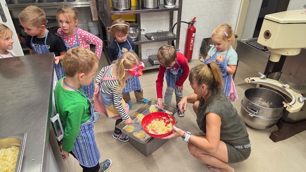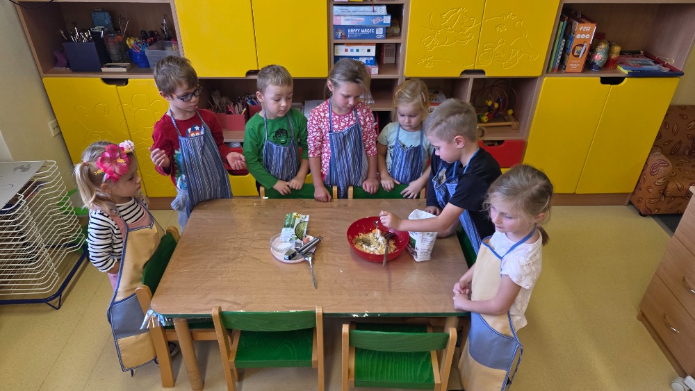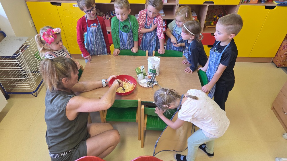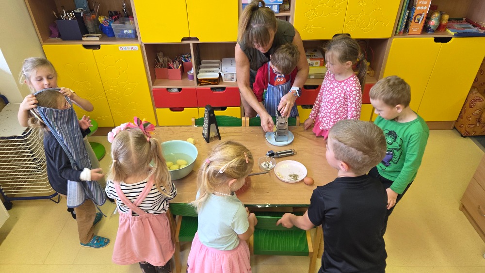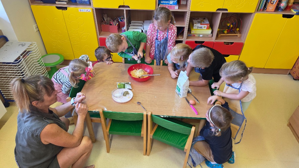 Bramborový týden jsme začali přípravou těsta na jednu z nejoblíbenějších pochoutek, bramboráku. Všichni jsme se tak stali malými kuchaříčky, kteří si přípravu zpříjemnili i říkankou Koulela se ze dvora, takhle velká brambora. Každý přiložil ruku k dílu, jak přípravou brambor, tak špetkou koření, mícháním a přípravou na plech. Ochutnávka těsta v syrovém stavu nemohla chybět. Na bramboráčky jsme se tak těšili, že někteří už nevydrželi čekat až nebudou horké a pustili se do nich způsobem ojedinělým :-D