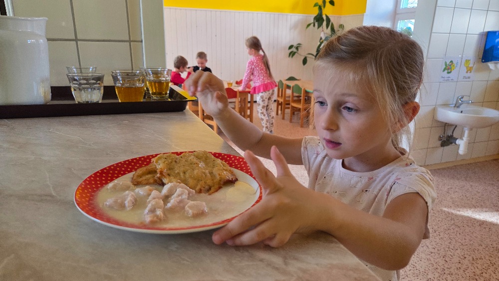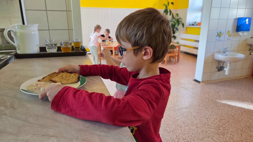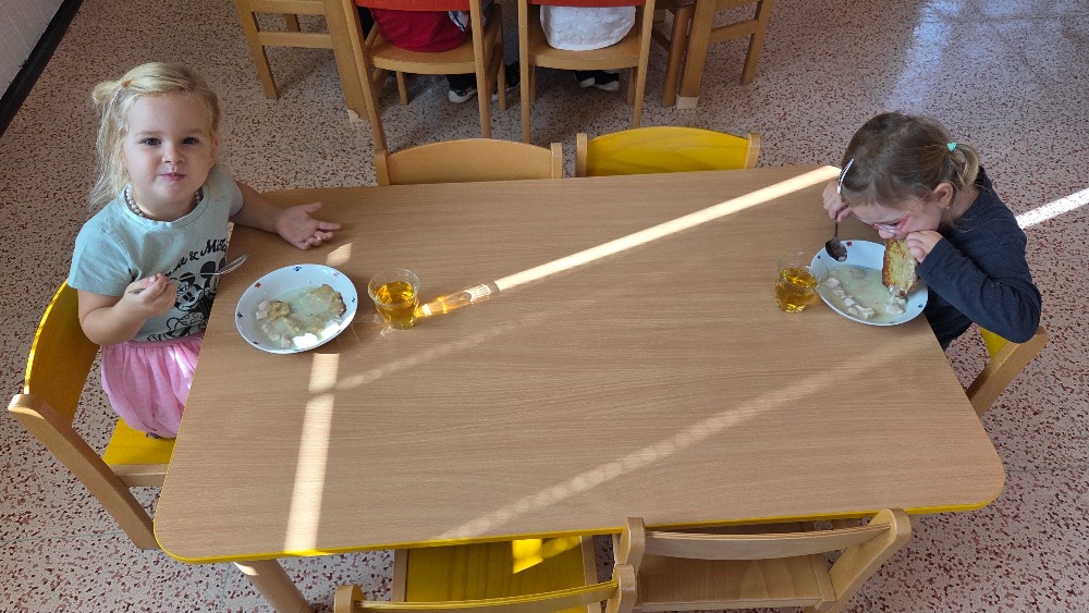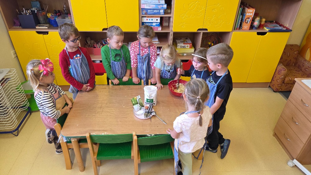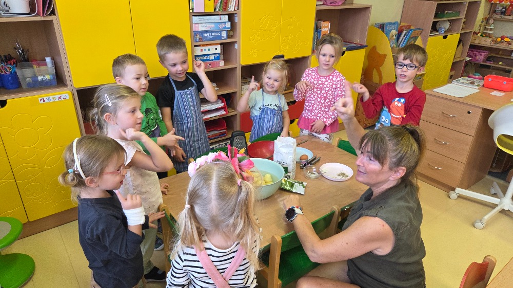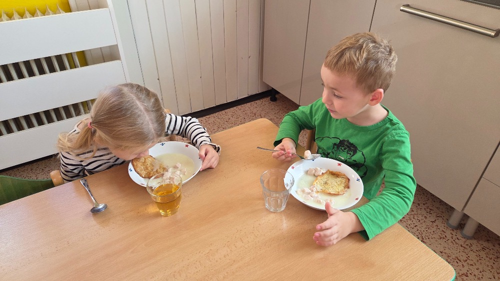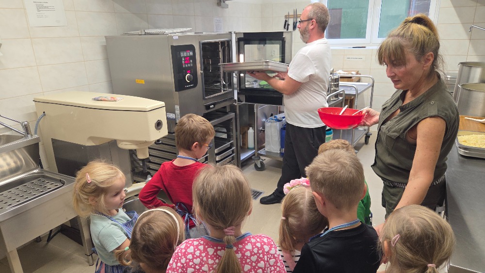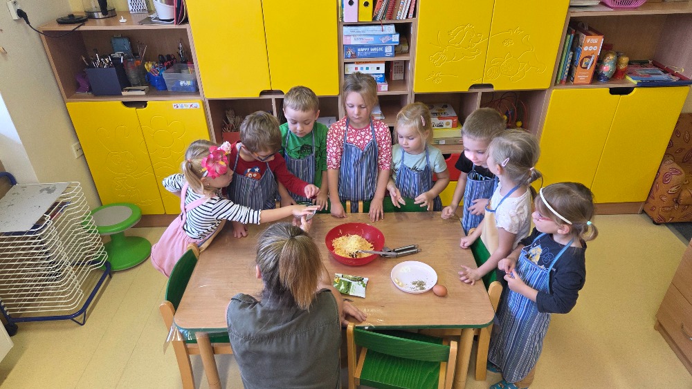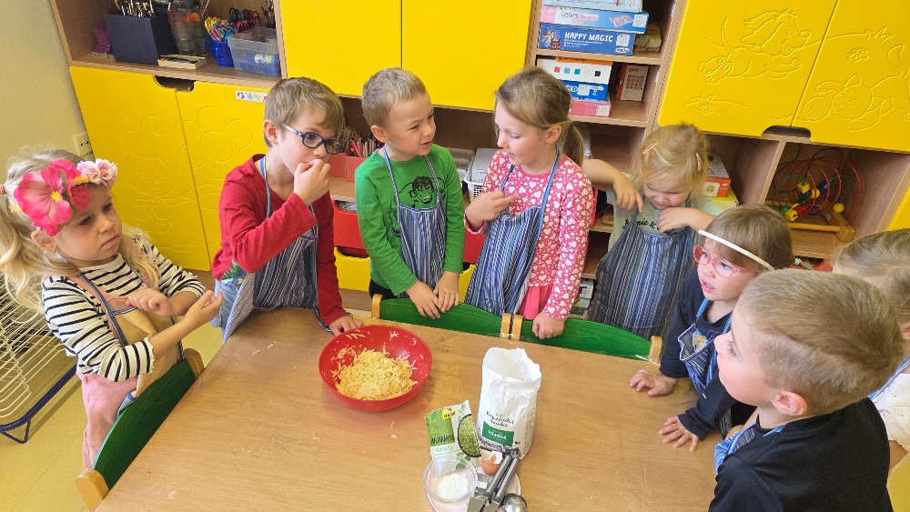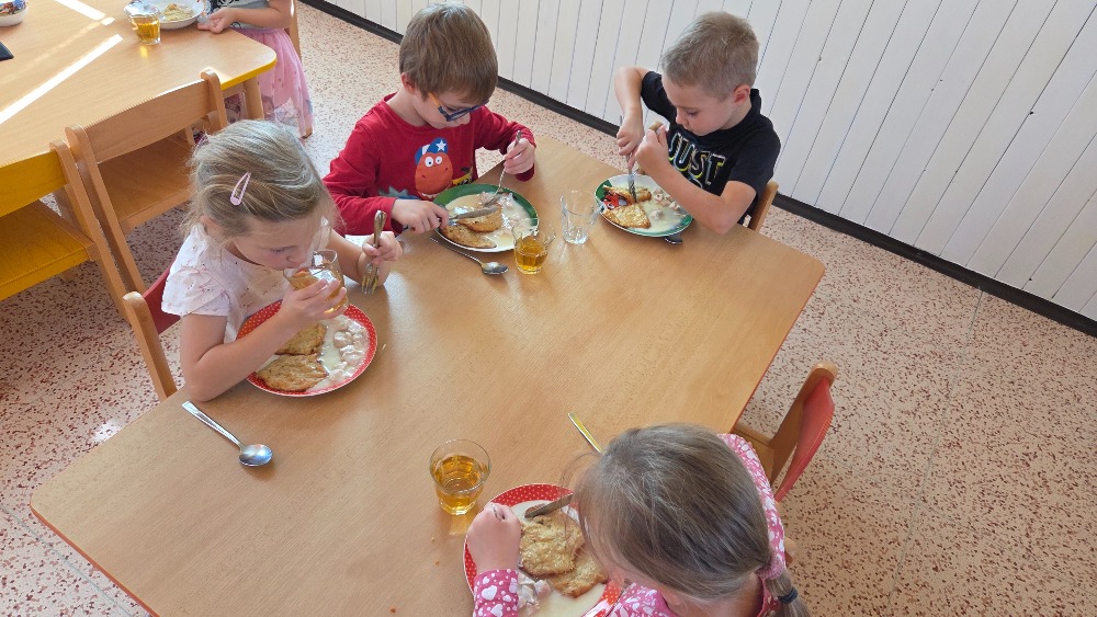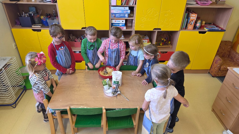 Bramborový týden jsme začali přípravou těsta na jednu z nejoblíbenějších pochoutek, bramboráku. Všichni jsme se tak stali malými kuchaříčky, kteří si přípravu zpříjemnili i říkankou Koulela se ze dvora, takhle velká brambora. Každý přiložil ruku k dílu, jak přípravou brambor, tak špetkou koření, mícháním a přípravou na plech. Ochutnávka těsta v syrovém stavu nemohla chybět. Na bramboráčky jsme se tak těšili, že někteří už nevydrželi čekat až nebudou horké a pustili se do nich způsobem ojedinělým :-D