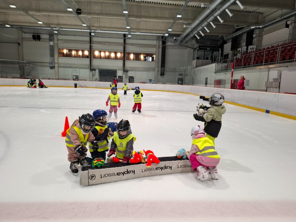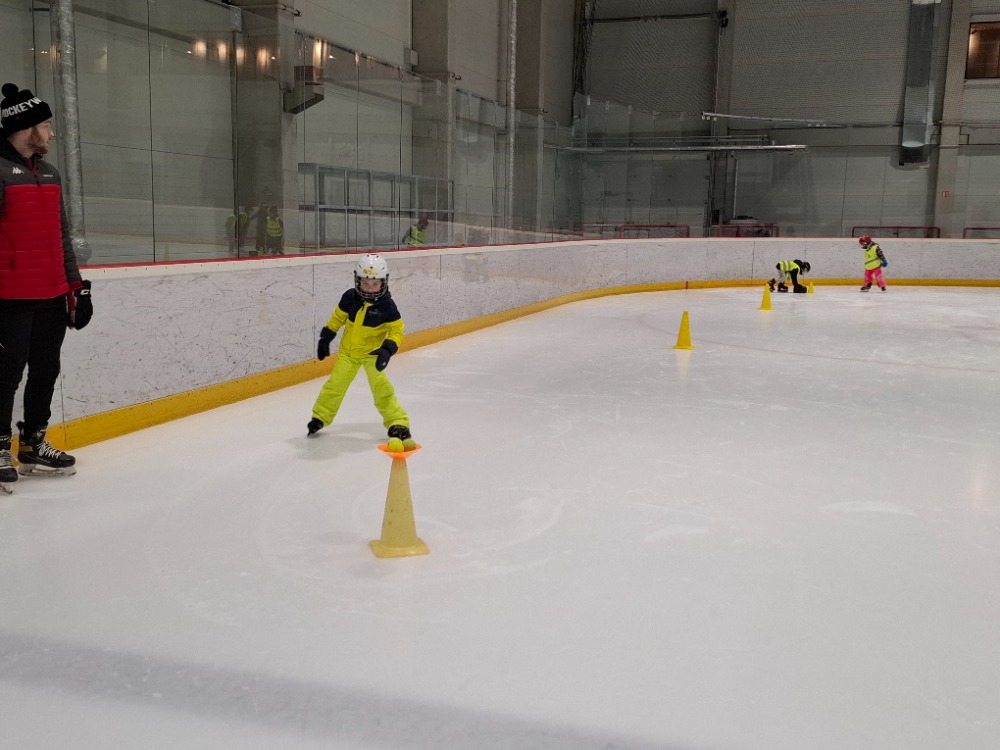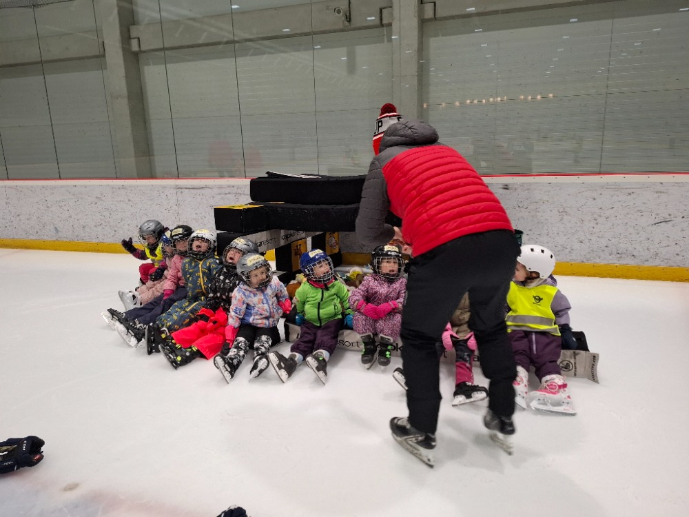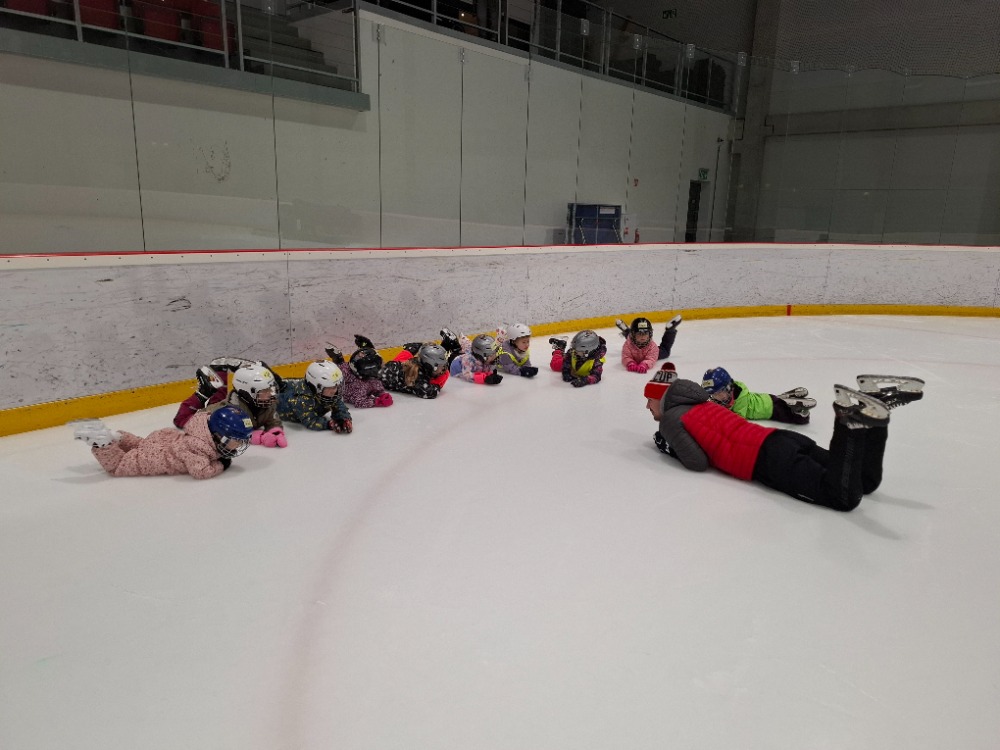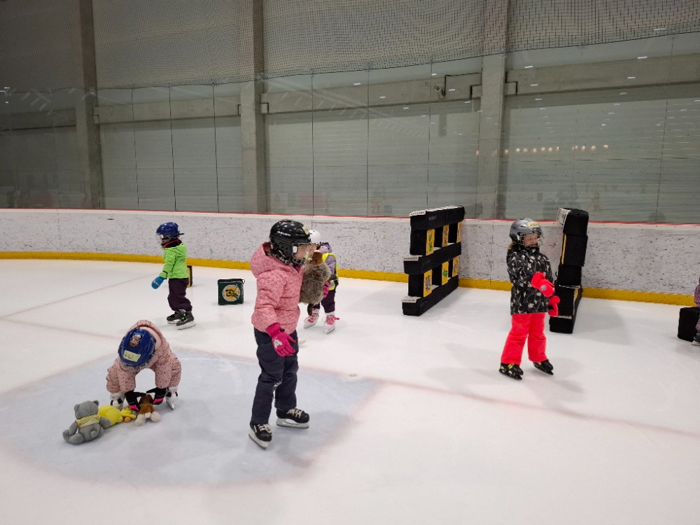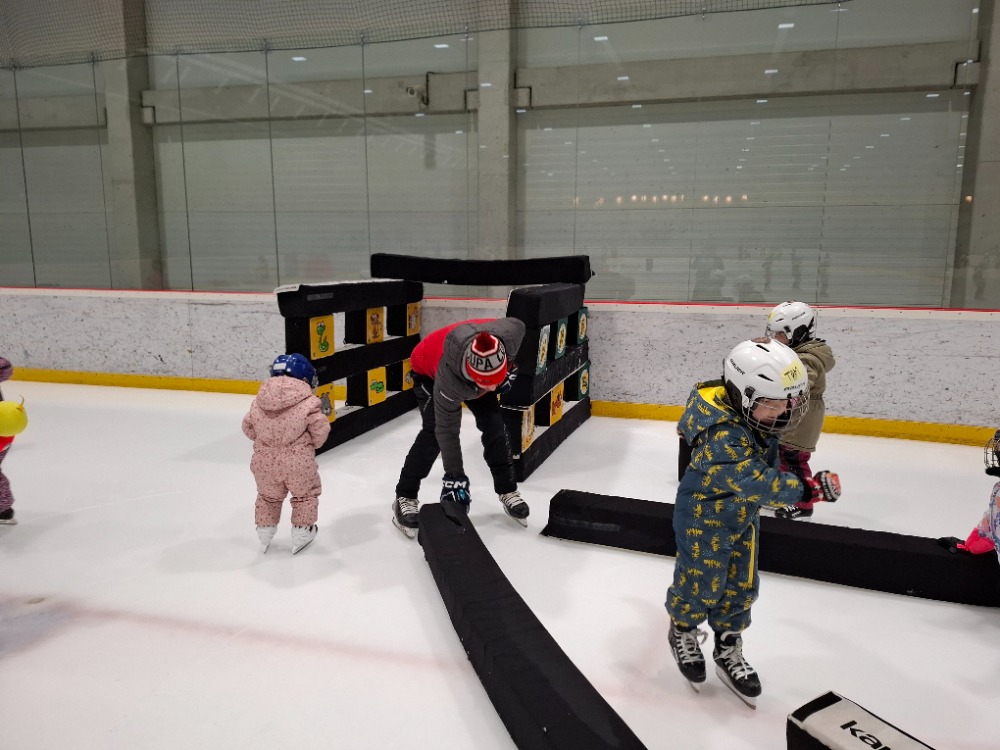 Děti z páté lekce bruslení se na ledě pohybují stále sebevědoměji a jistěji. Některé dnes s radostí stavěly domek pro zvířátka, ve dvojicích si hrály na vláčky, kdy jeden vedl a druhý se s úsměvem nechal vést po ledě, zatímco jiné pilovaly obratnost v slalomu. Velkou výzvou bylo také sbírání míčků za jízdy, které zvládly s velkým nasazením. Všechny děti si zaslouží velkou pochvalu za snahu, odvahu a radost z bruslení.