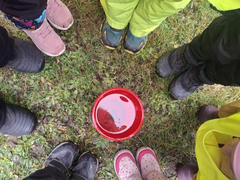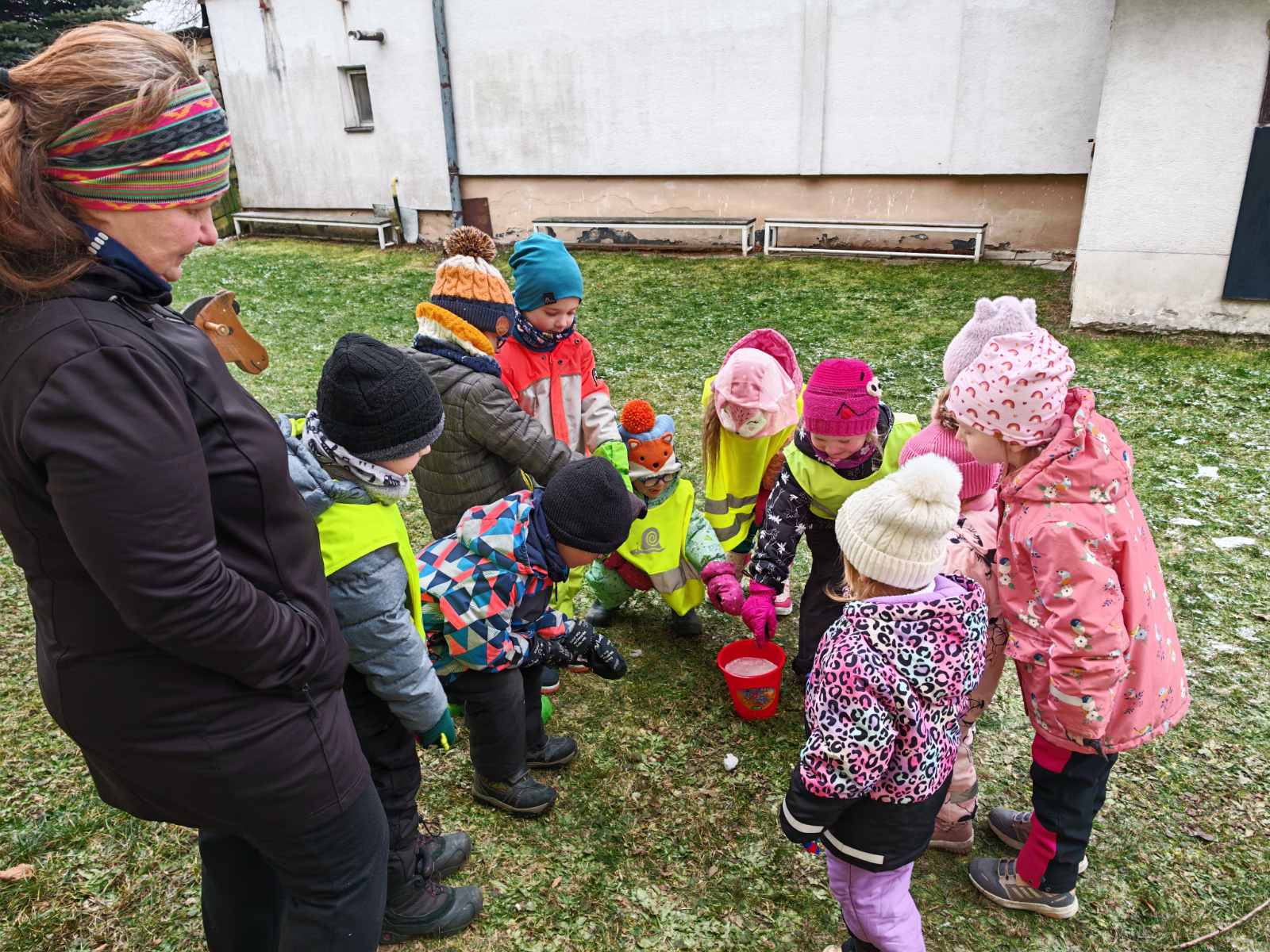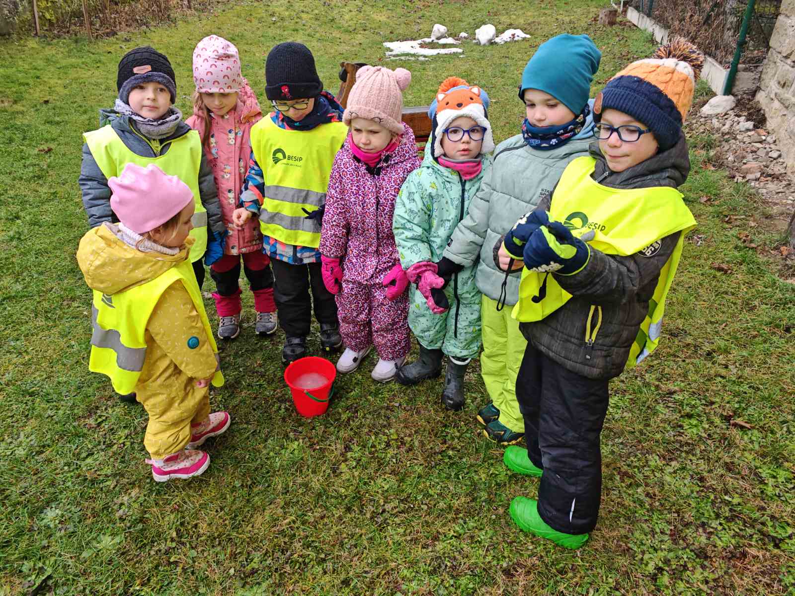 Děti tak mohly pozorovat, že sníh na trávě taje rychleji, zatímco v kyblíku dokáže zůstat déle a mění se postupně – z pevného sněhu na vodu. Pokus ukázal, jak počasí ovlivňuje sníh – a děti byly nadšené, že mohly sledovat proměny na vlastní oči!