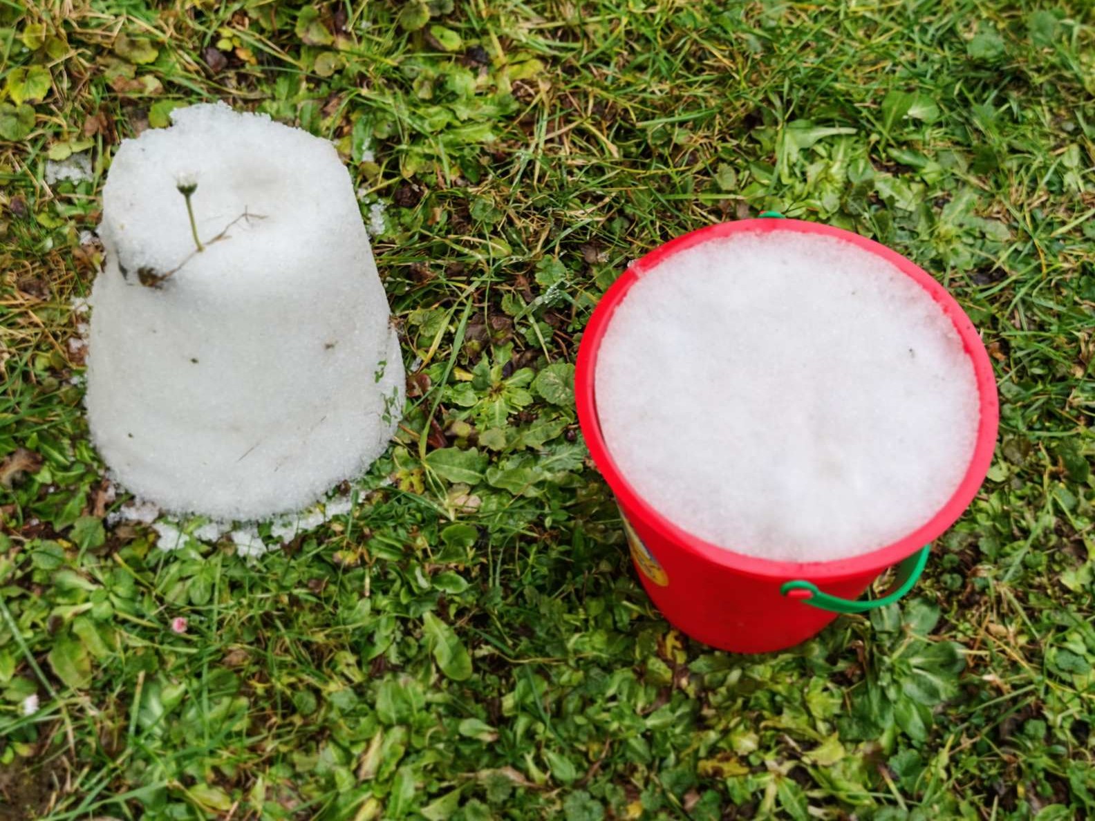 Z jednoho kyblíku jsme sníh vysypali na trávu, druhý jsme nechali v kyblíku. Děti si tipovaly, který sníh bude tát rychleji a co se vlastně stane. Pokus trval téměř dva týdny – většinou přes den sníh tál a v noci zmrzl.