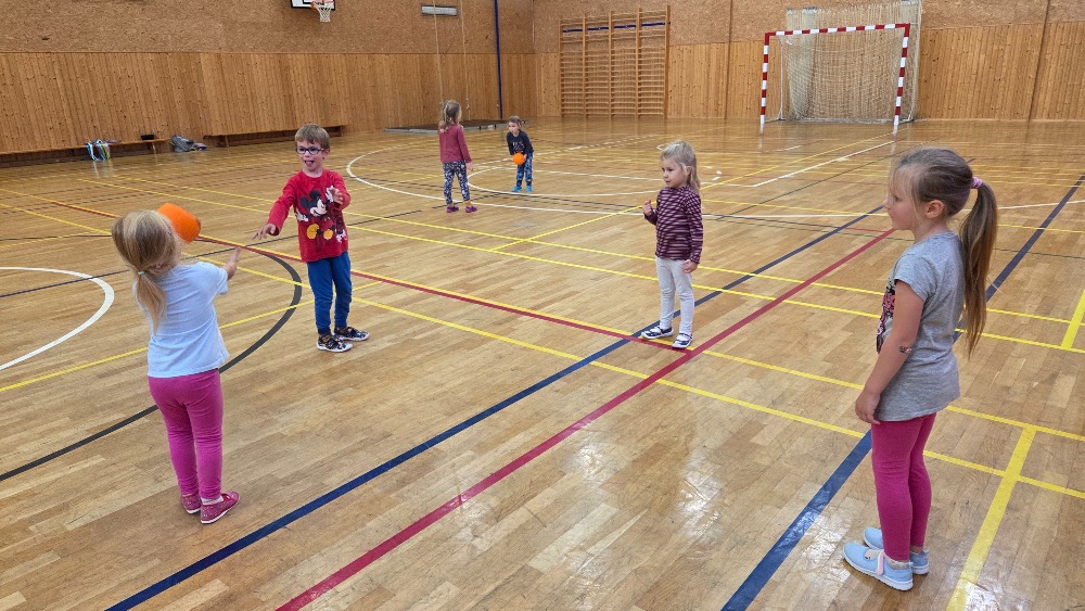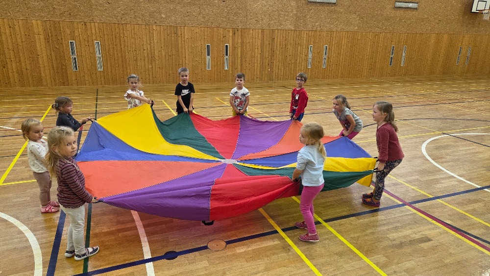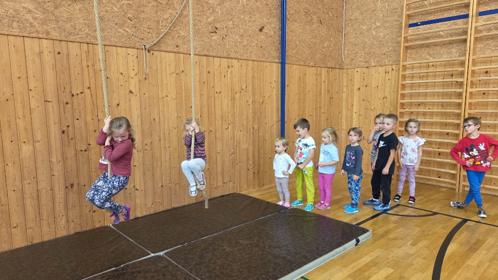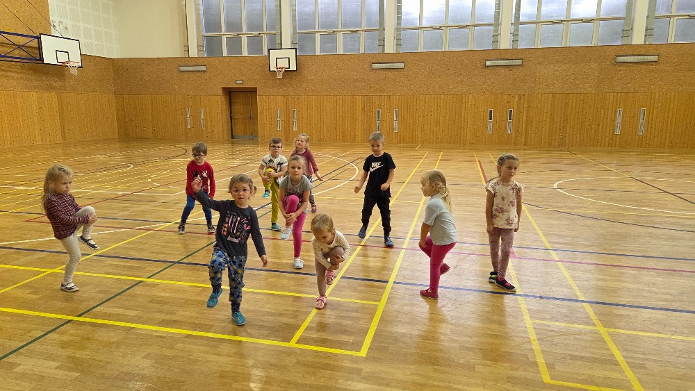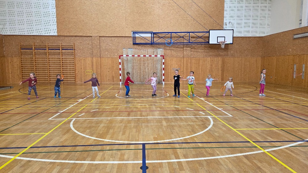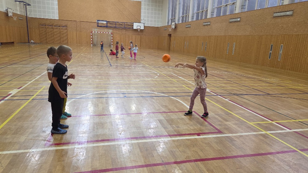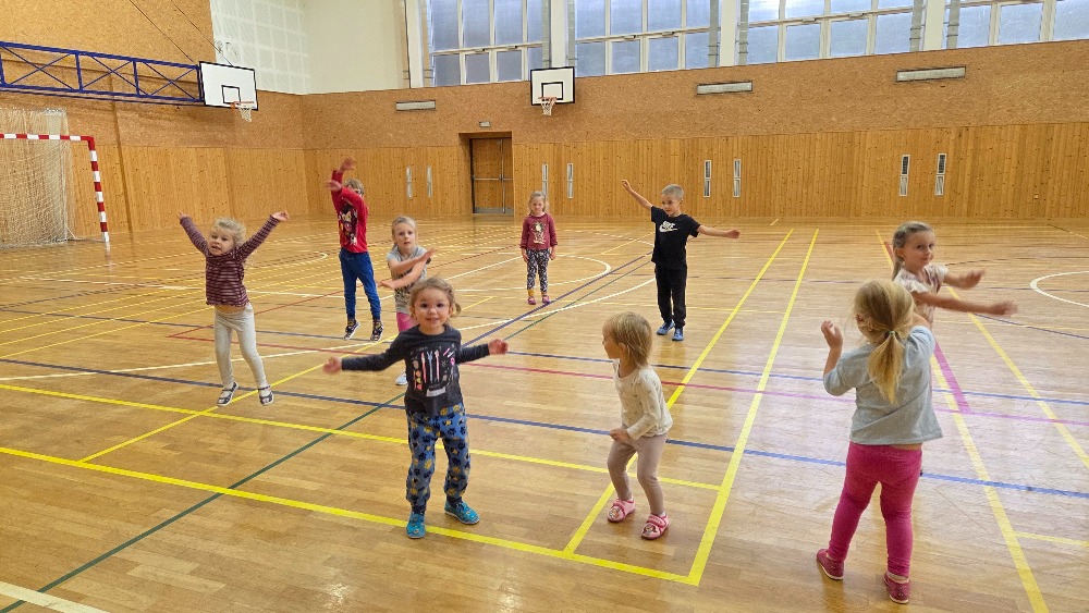 S příchodem podzimního počasí si každé úterý velice rádi chodíme protáhnout naše těla do místní sportovní haly. Zahřátí s hudbou, rozcvička s říkankou, nové cvičení s obručemi a míči, hry s padákem, pohybové hry plné zábavy a smíchu. To je stručný výběr z mnoha dalších aktivit, kterých si v hale naplno užíváme. Jenom je škoda, že vyhrazený čas nám tam vždycky tak rychle uběhne.