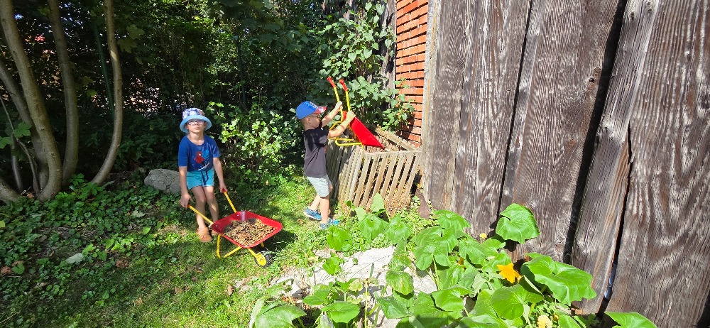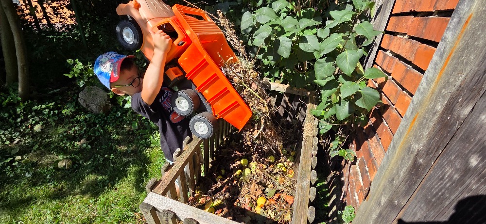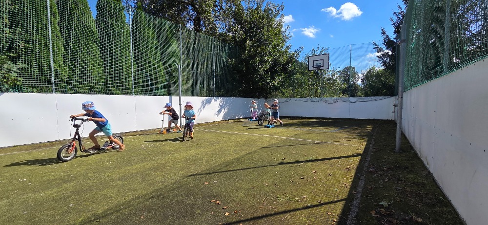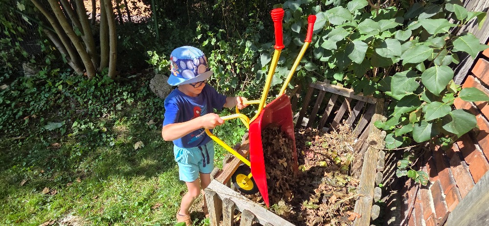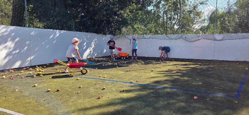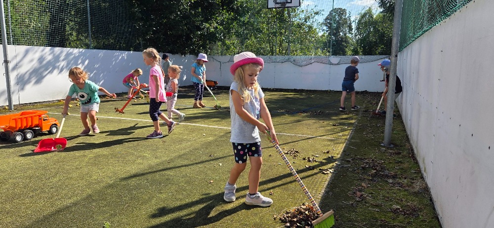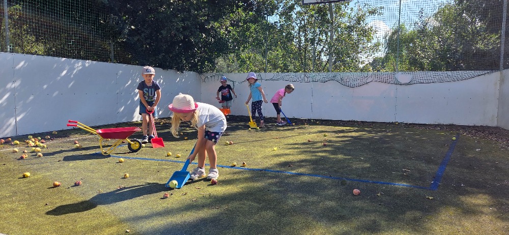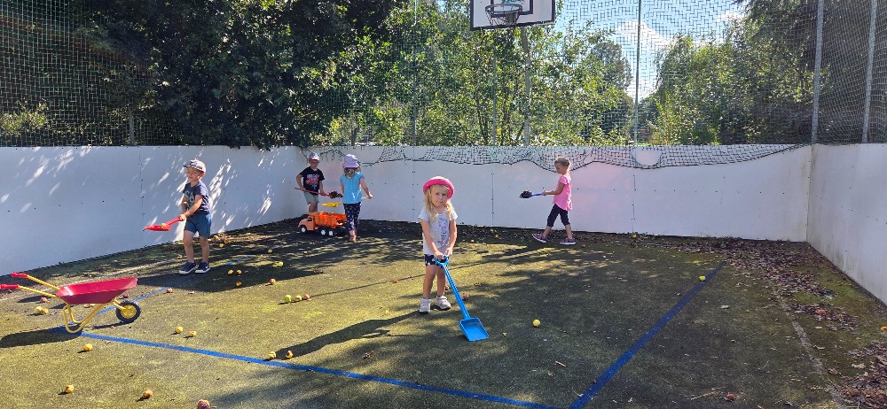 Koloběžky a odrážedla už máme připravená. A co hřiště? To si musíme první uklidit! Spadaná jablíčka a listí všichni společně uklidíme a tradááá, můžeme bezpečně jezdit.