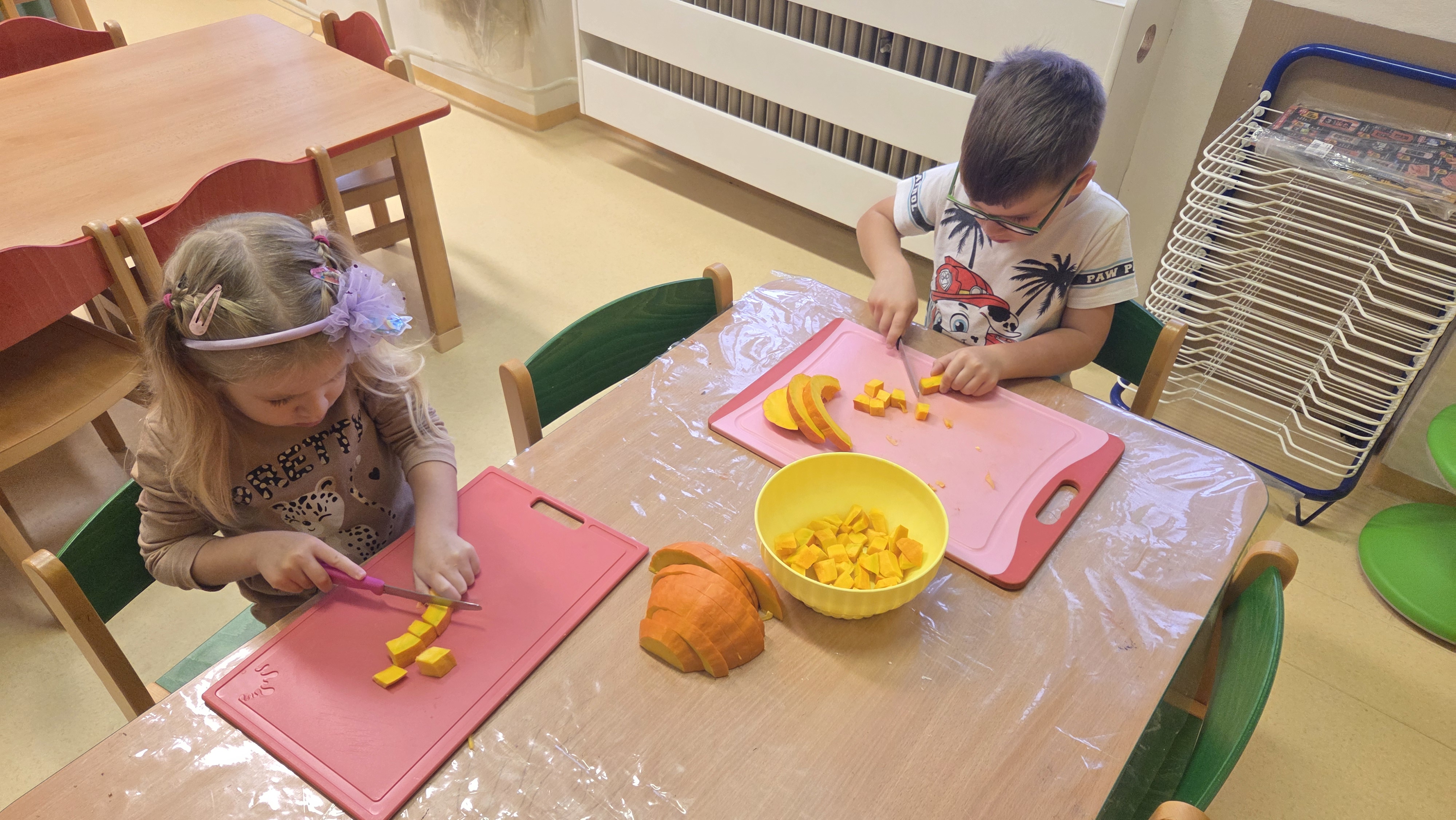 S příchodem podzimního počasí si každé úterý velice rádi chodíme protáhnout naše těla do místní sportovní haly. Zahřátí s hudbou, rozcvička s říkankou, nové cvičení s obručemi a míči, hry s padákem, pohybové hry plné zábavy a smíchu. To je stručný výběr z mnoha dalších aktivit, kterých si v hale naplno užíváme do příchodu jara.