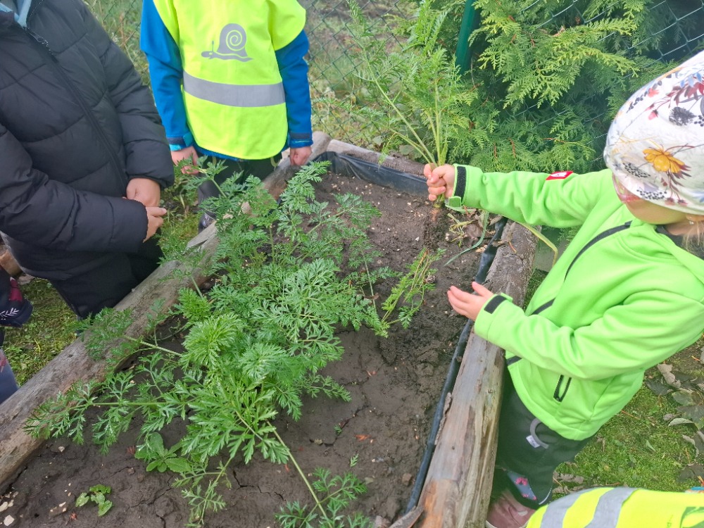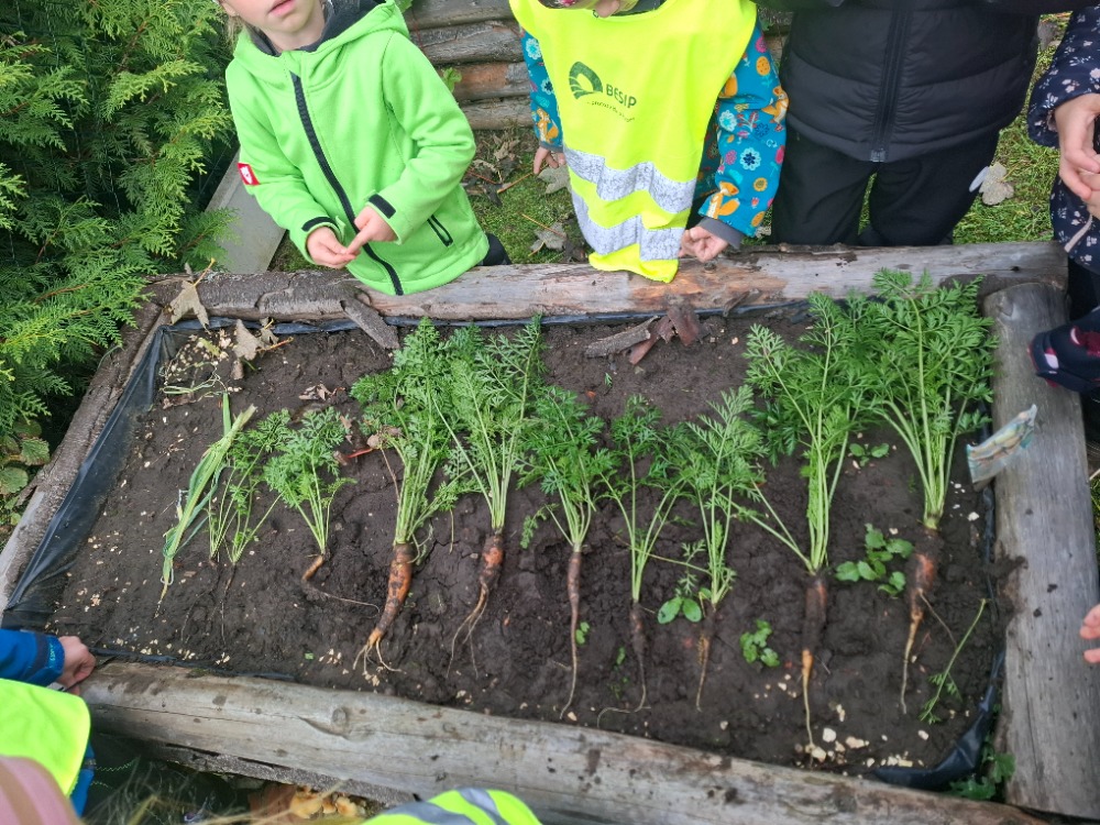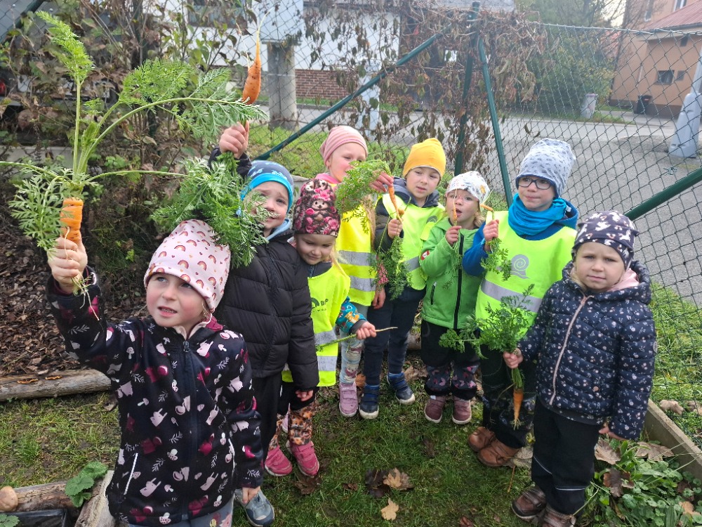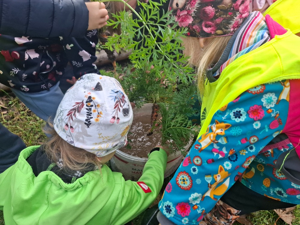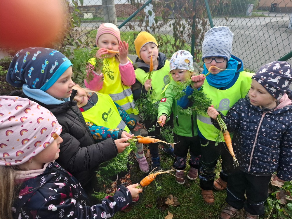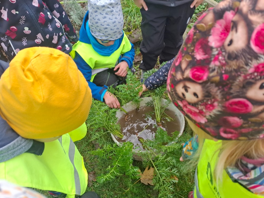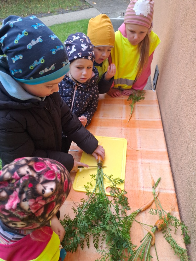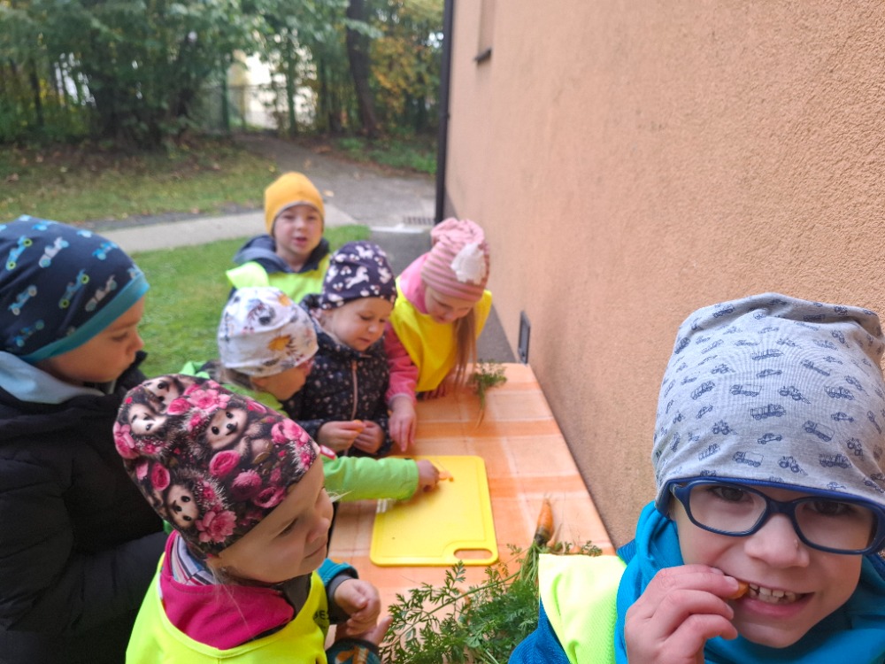 Některé mrkvičky jsme si nechali na zítřejší zeleninovou polévku, kterou si děti společně uvaříme ve školce. Bude to skvélé pokračování naší práce na zahradě a děti se těší, jak si pochutnají na polévce, kterou si připraví z vlastních sklizených plodů.