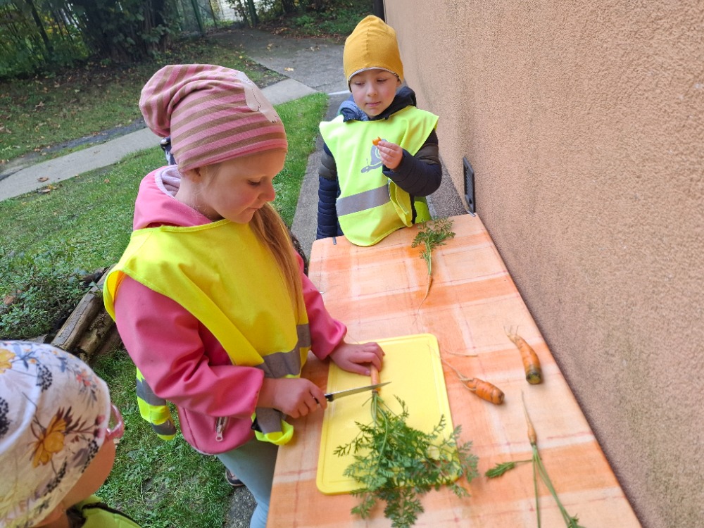 Poté jsme každou mrkvičku důkladně umyli, odstranili z ní listy a odnesli je na kompost, kde se o ně postará příroda. Děti se zároveň učily, jak je důležité, aby každá část rostliny skončila na správném místě. Nakonec přišla ta nejlepší část – ochutnávka! Čerstvá mrkvička, kterou jsme právě sklidili, byla tak sladká a chutná, že jsme si ji s chutí dali.