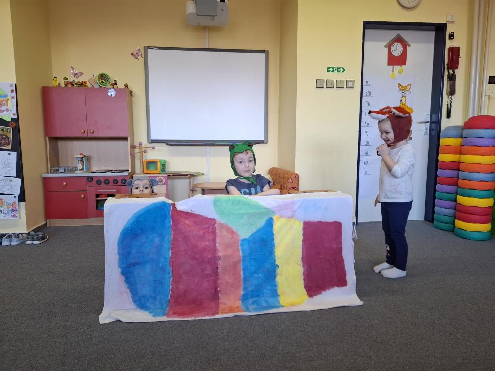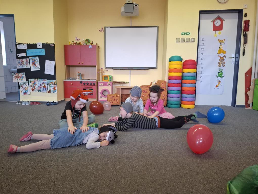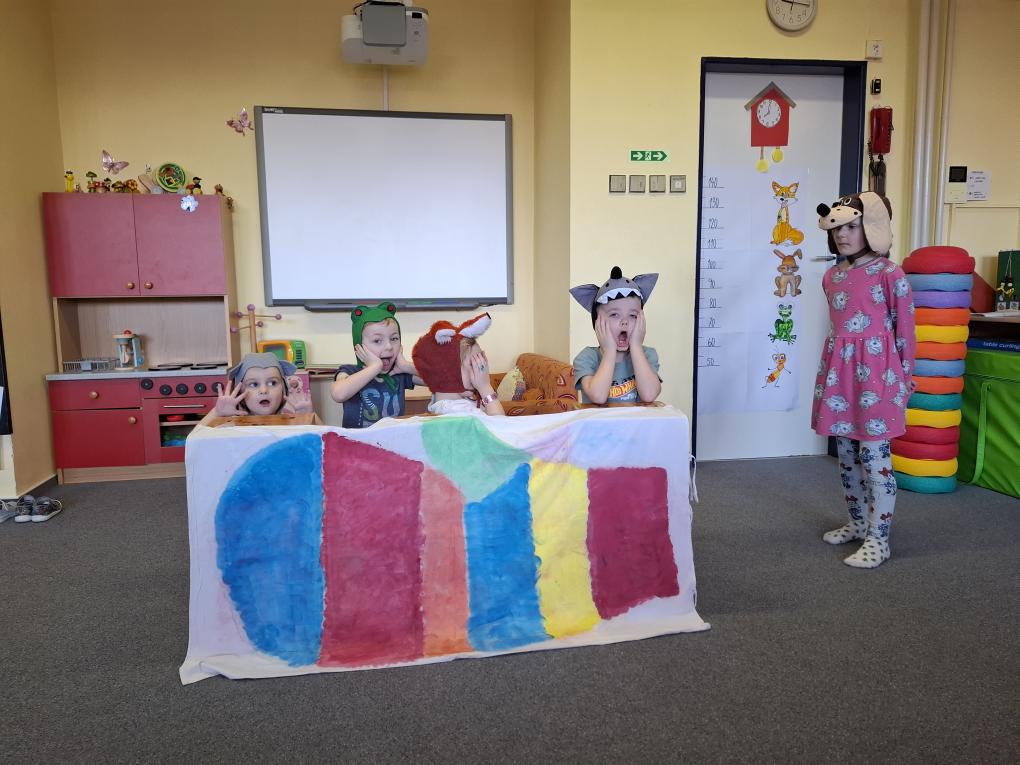 Zdramatizovali jsme si pohádku „O rukavičce“ – děti se proměnily na zvířátka a samy zahrály celý příběh, k němu jsme se naučili veselou písničku.