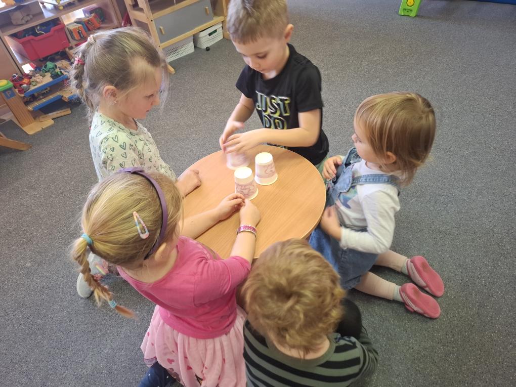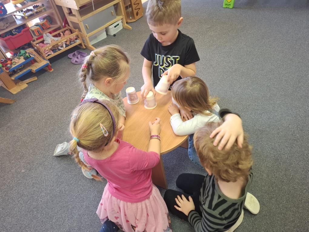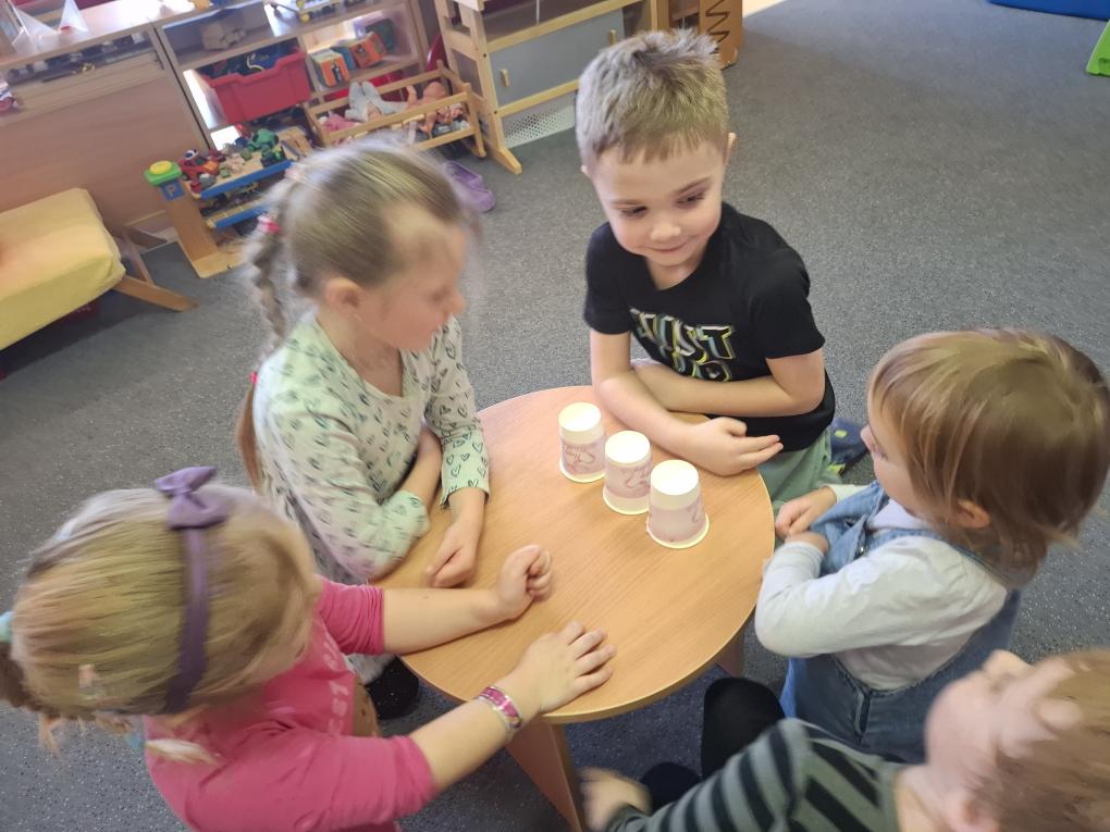 Dále jsme vyráběli žabího prince z papíru, kouzlili, řešili hádanky, cvičili s koblížky, navlékali korálky a venku si užili hry „Na ovečky a vlka“ a „Na tři prasátka“. Nejvíce děti bavila vzájemná masáž inspirovaná zaděláváním těsta na koblížky – a míchali jsme těsto několikrát každý den!