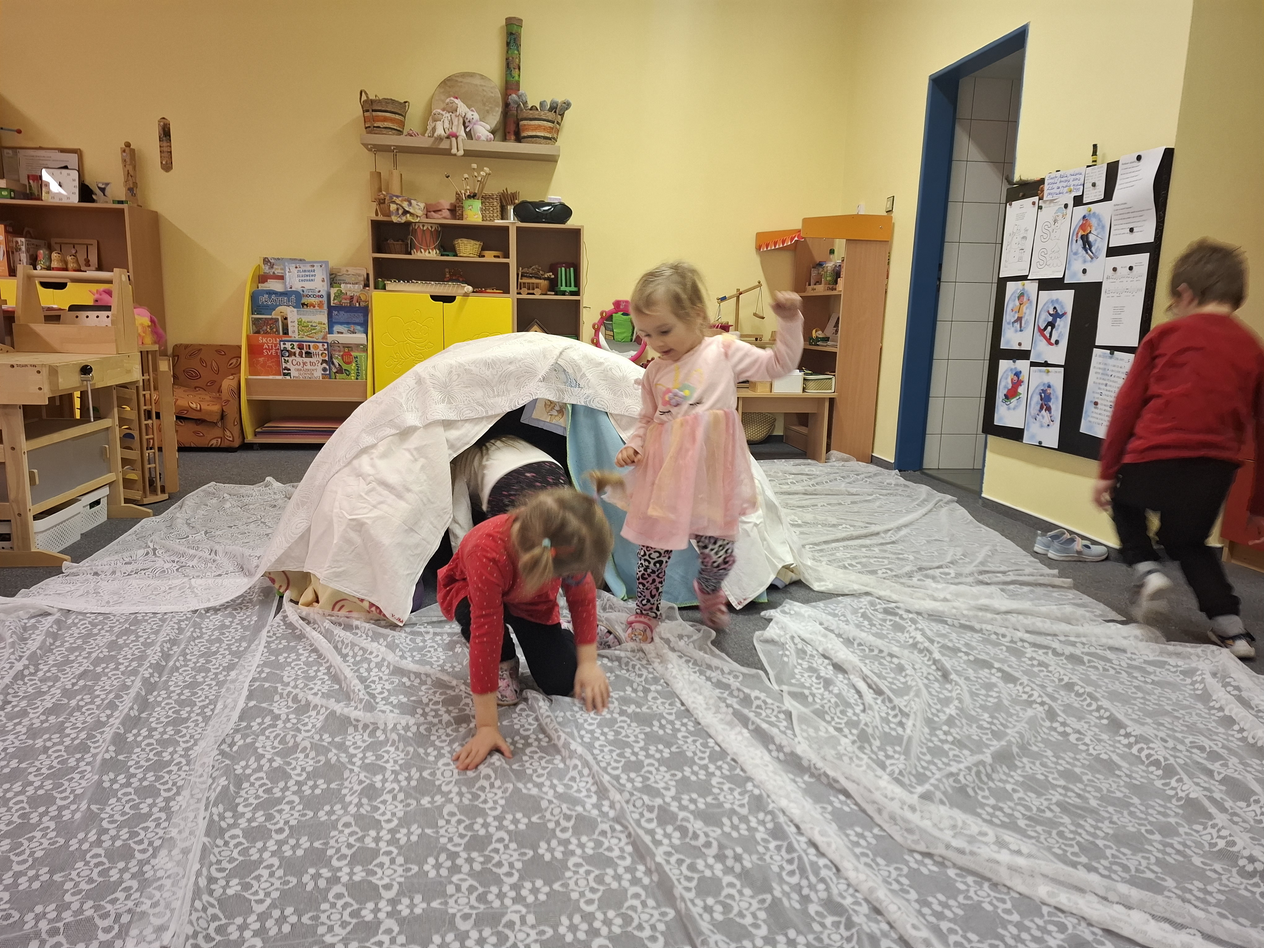 Mrazivé počasí nám přece jen něco zanechalo – ztvrdlé sněhové krusty a ledové kry, ze kterých jsme venku společně stavěli malé ledové království. Děti s nadšením objevovaly, co všechno se dá z kousků ledu a sněhu vytvořit, a fantazie pracovala na plné obrátky.