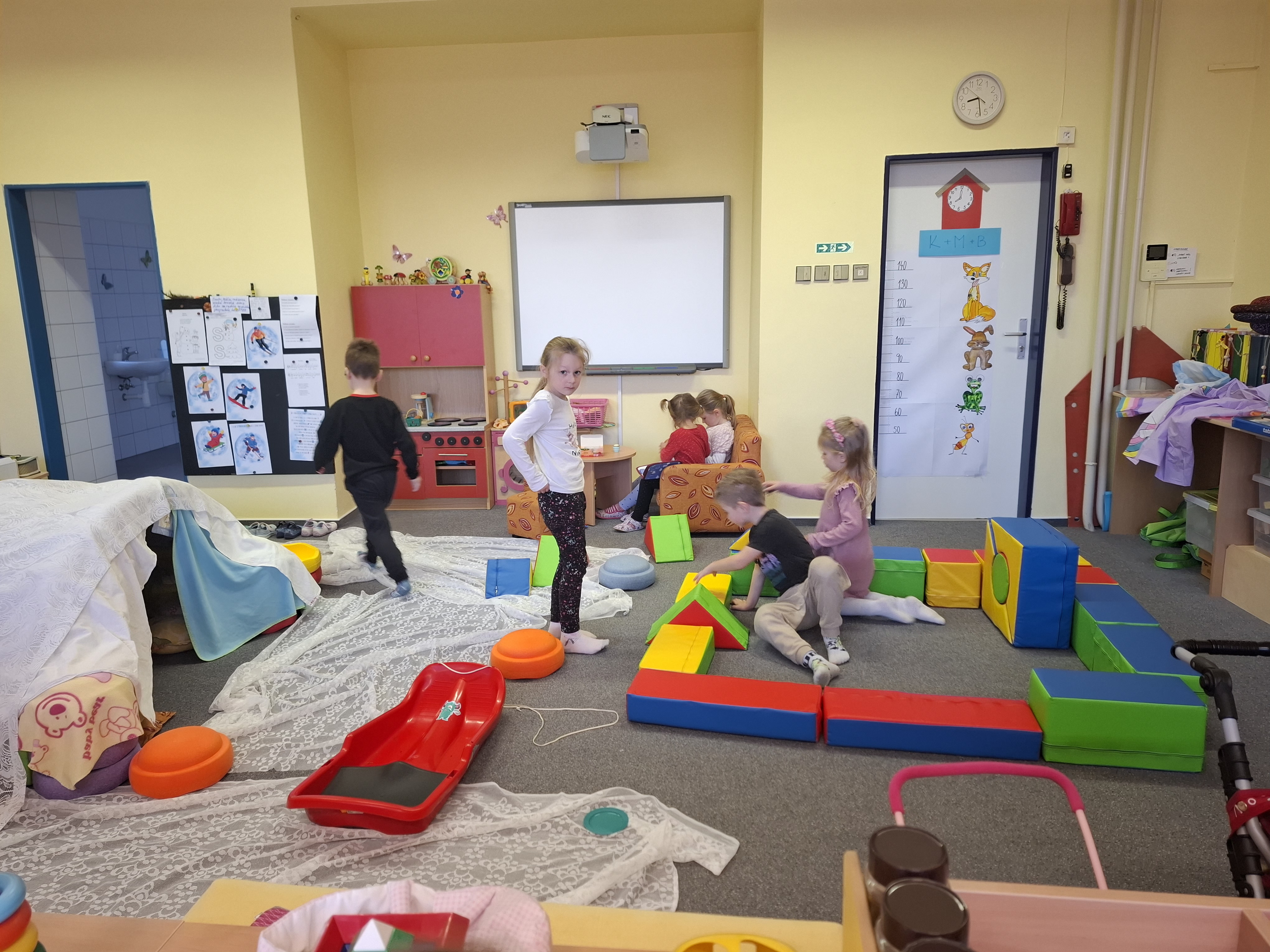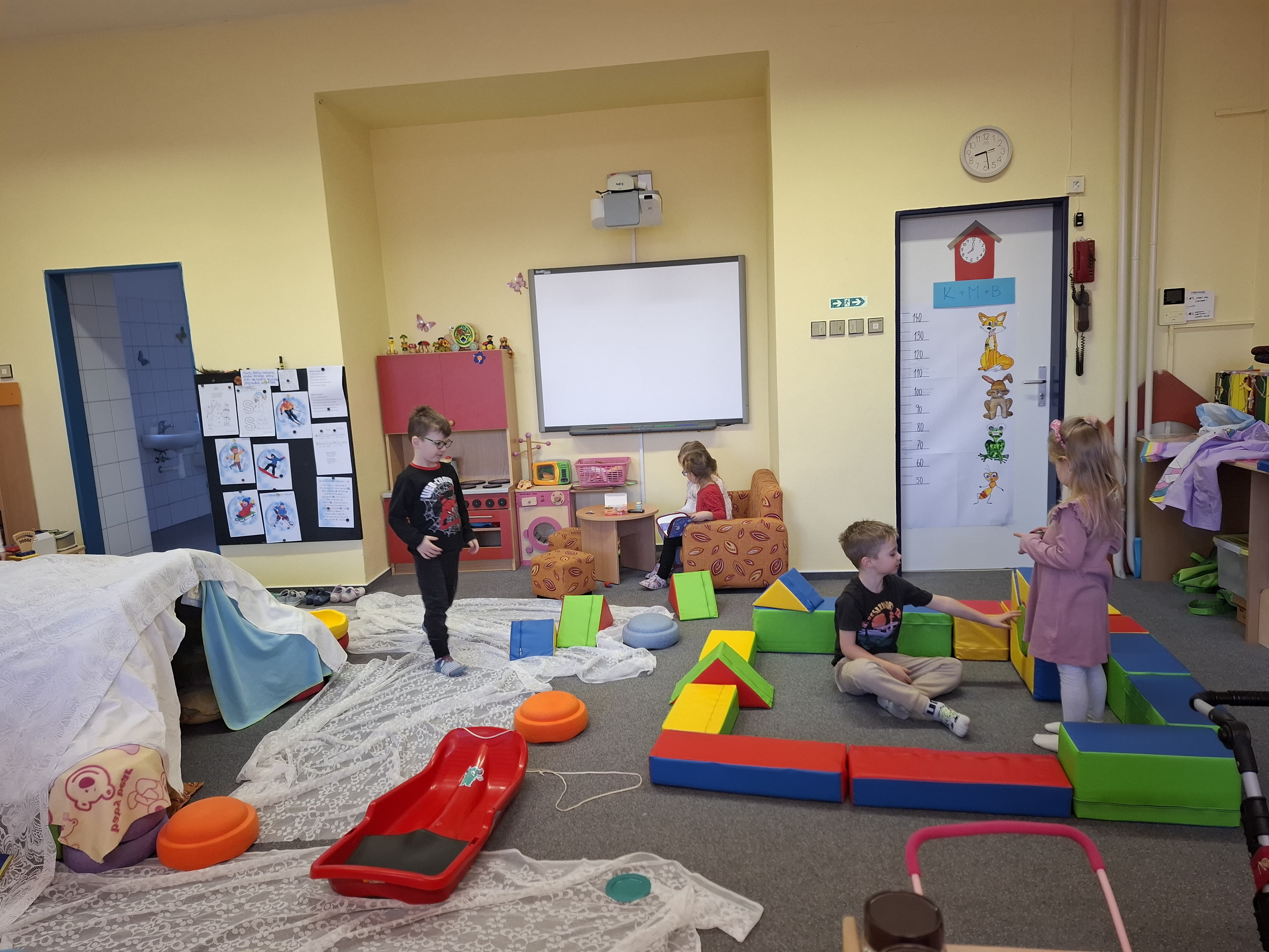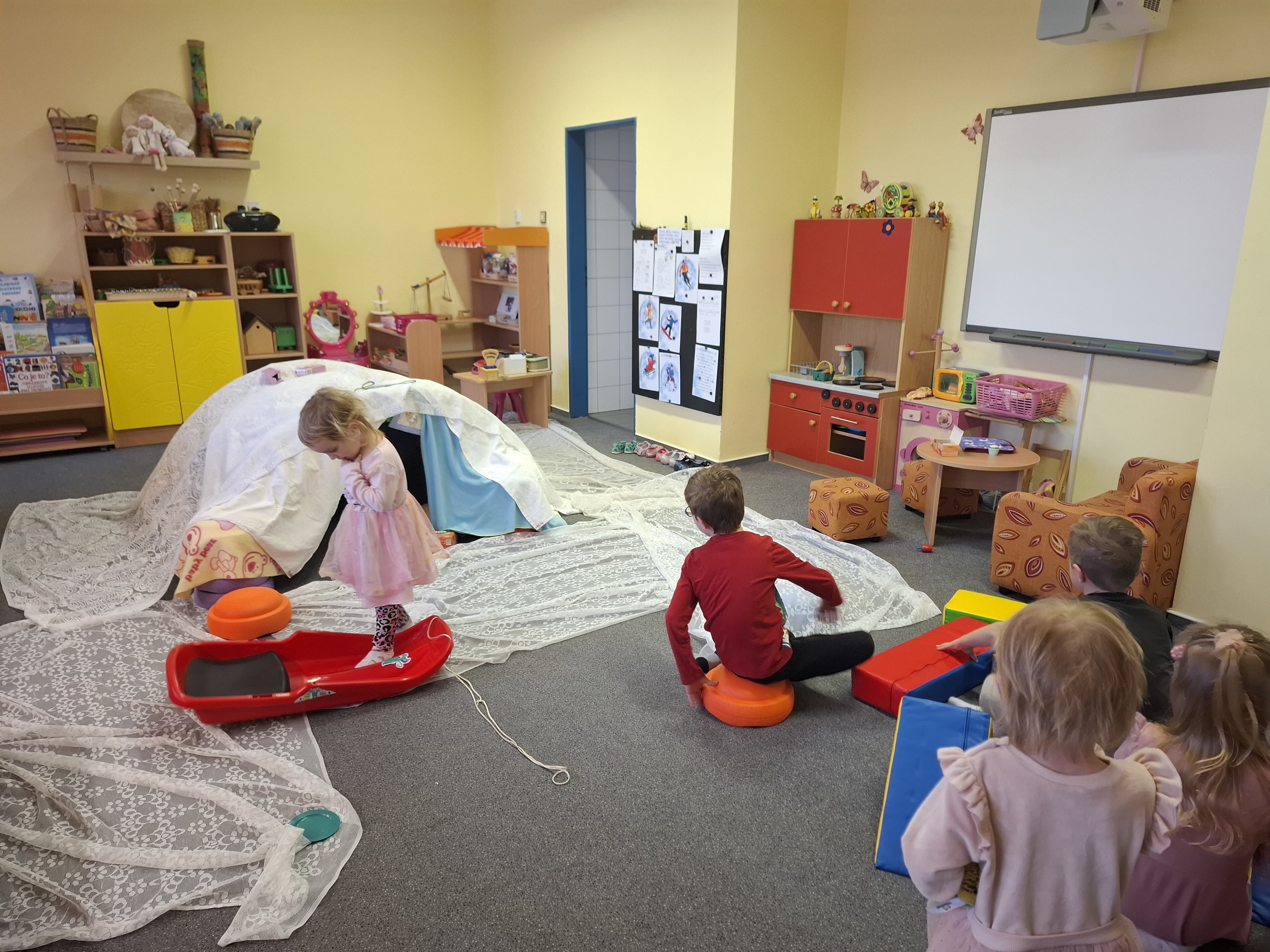 Protože sněhu nebylo dost na klasické koulování, poradili jsme si po svém. Ve školce jsme si postavili iglú a proměnili se v Eskymáky. Z papíru jsme mačkali „sněhové“ koule a s chutí jsme se s nimi koulovali. Nechybělo ani tvoření sněhuláků – s pomocí barev, papíru a vaty vznikali nejrůznější veselí sněhuláci, kteří nám teď zdobí prostory školky.
