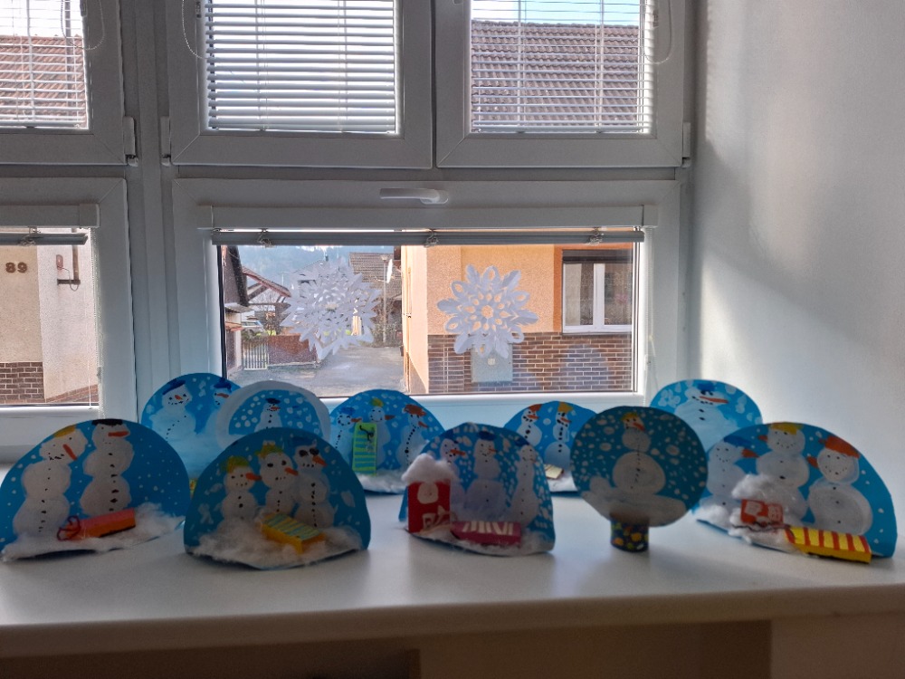 Protože sněhu nebylo dost na klasické koulování, poradili jsme si po svém. Ve školce jsme si postavili iglú a proměnili se v Eskymáky. Z papíru jsme mačkali „sněhové“ koule a s chutí jsme se s nimi koulovali. Nechybělo ani tvoření sněhuláků – s pomocí barev, papíru a vaty vznikali nejrůznější veselí sněhuláci, kteří nám teď zdobí prostory školky.