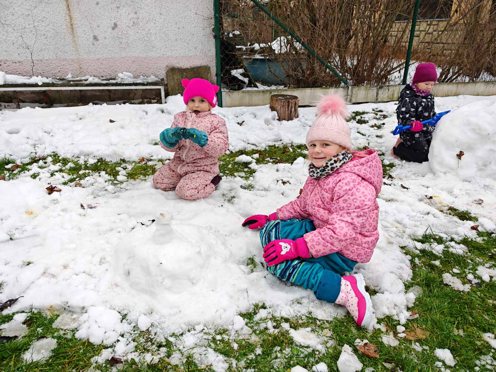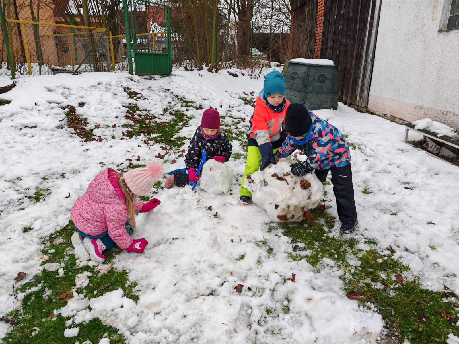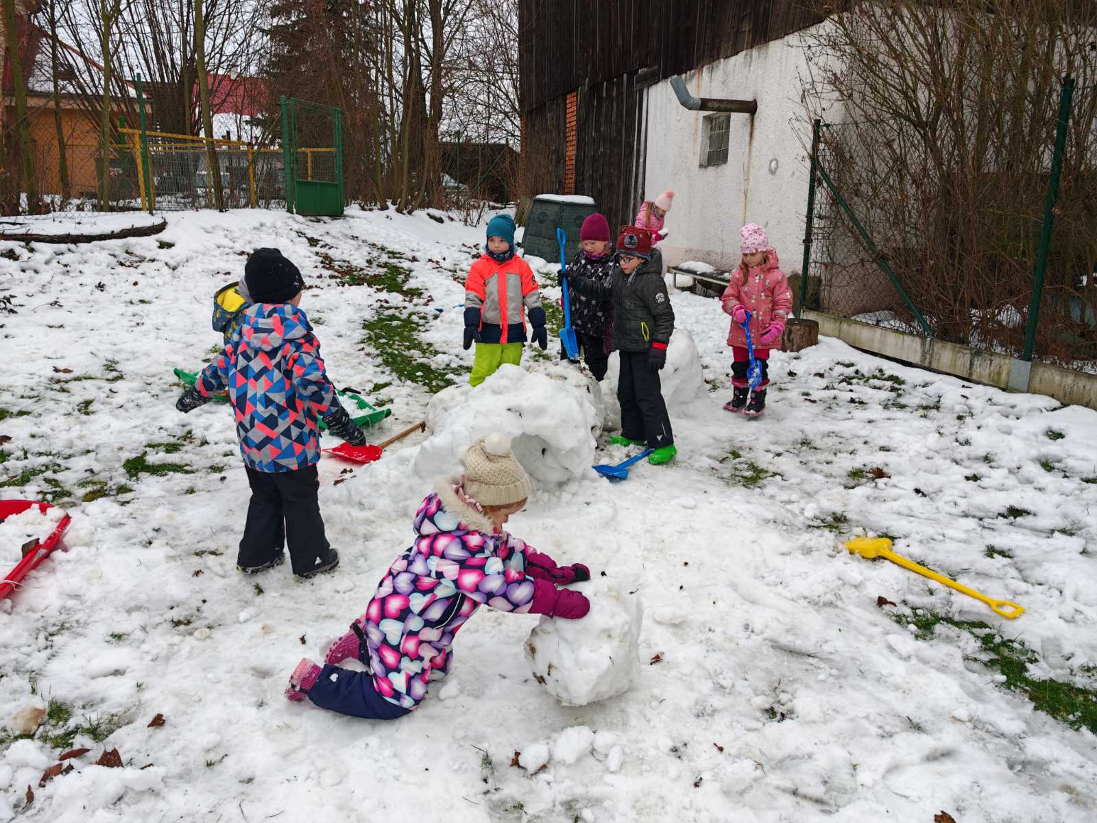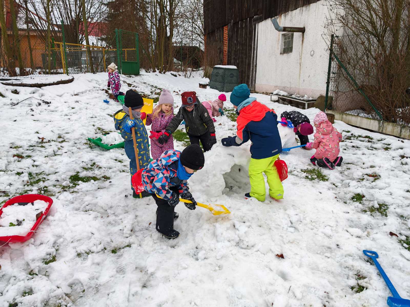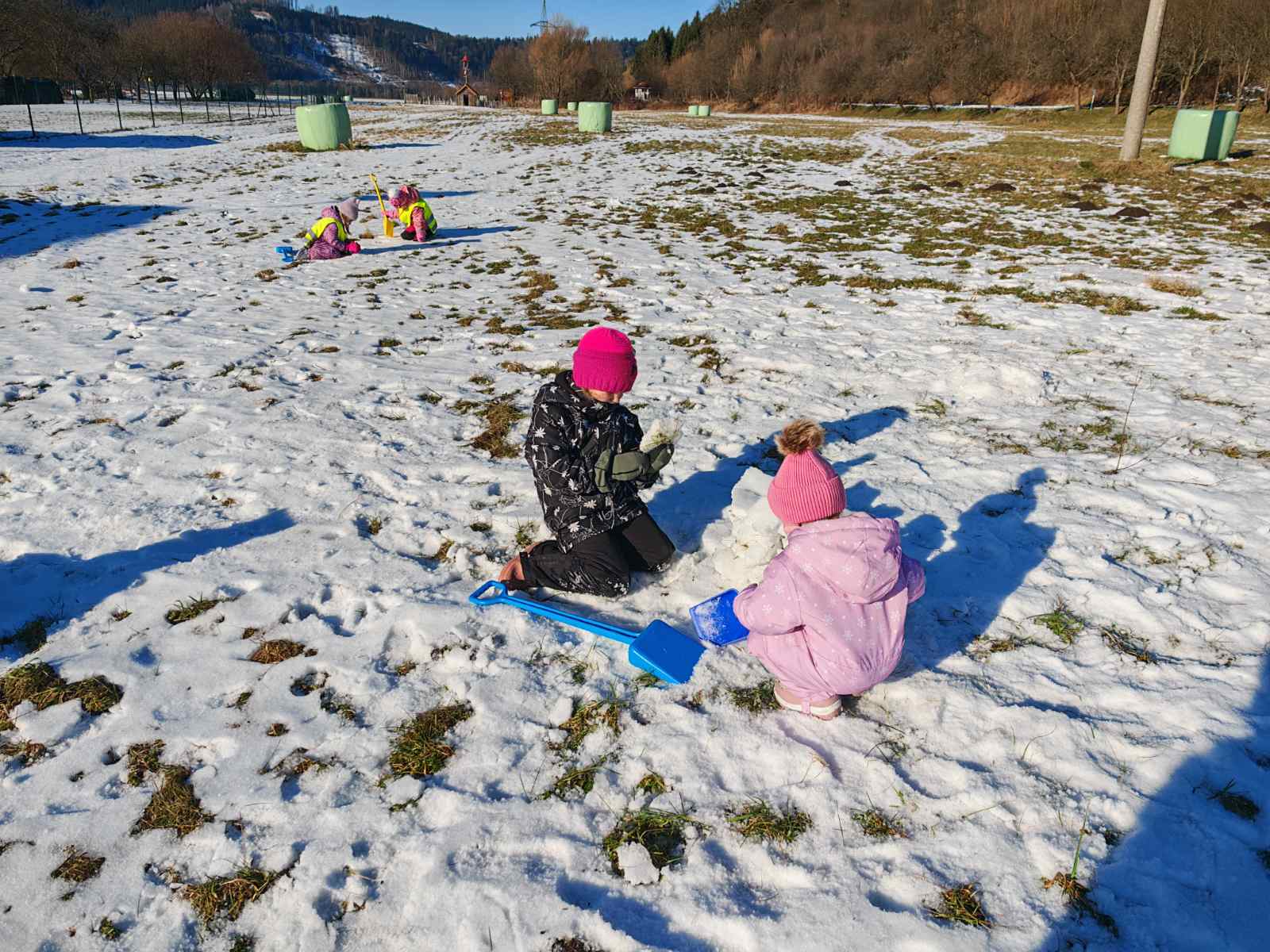 Mrazivé počasí nám přece jen něco zanechalo – ztvrdlé sněhové krusty a ledové kry, ze kterých jsme venku společně stavěli malé ledové království. Děti s nadšením objevovaly, co všechno se dá z kousků ledu a sněhu vytvořit, a fantazie pracovala na plné obrátky.