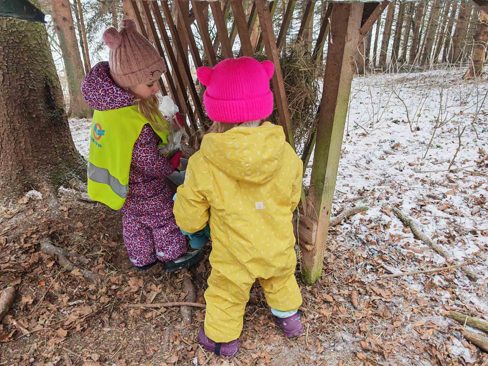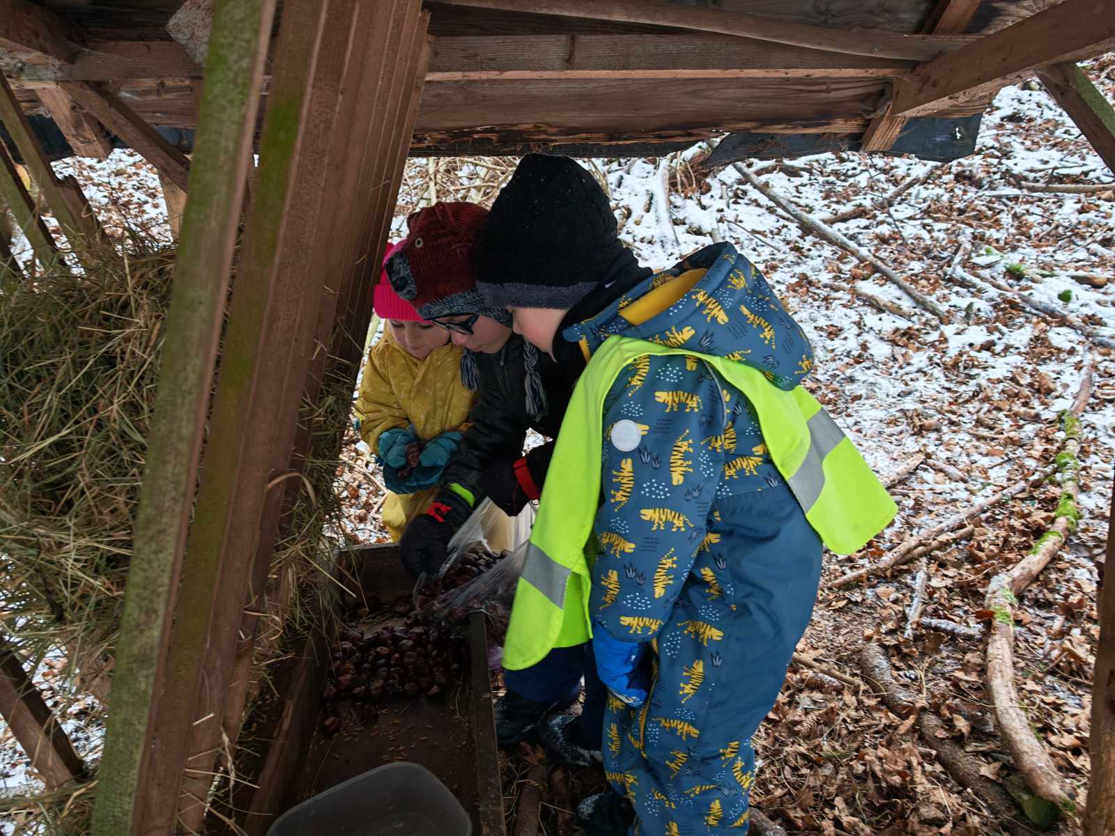 Během týdne jsme mysleli i na ptáčky a zvířátka v lese. Ptáčkům jsme nasypali zobání do krmítka a zvířátkům do krmelce donesli kaštany a povídali jsme si o tom, jak je důležité v zimě na lesní obyvatele myslet.