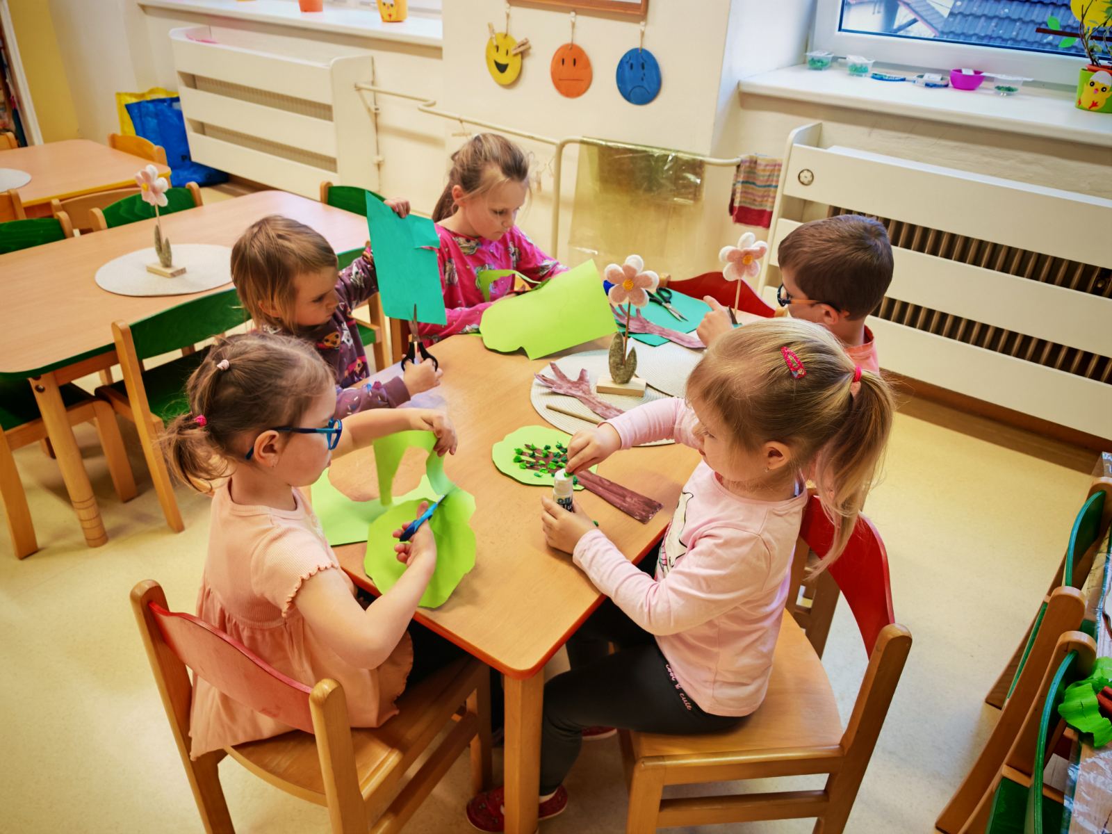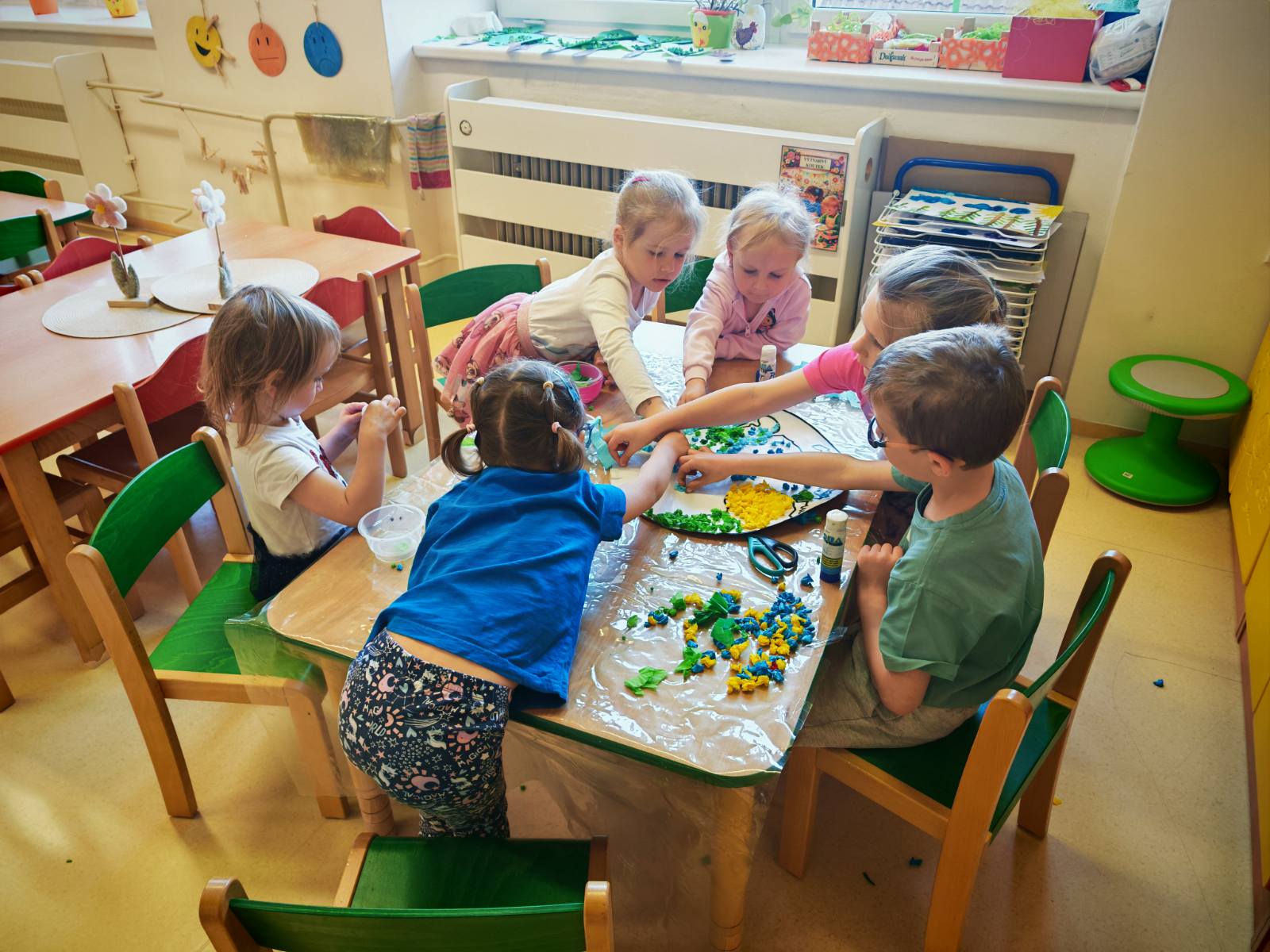 K tématu Dne Země jsme si s dětmi povídali o tom, co naší Zemi prospívá, co jí škodí a jak ji můžeme chránit. Naučili jsme se také třídit odpad do barevných popelnic. Na závěr děti společně vytvořily Zemi z barevného krepového papíru, kde znázornily kontinenty, oceány i moře. Kolem této planety pak každý doplnil svůj vlastní strom vytvořený obkreslením ruky. Vznikla tak krásná společná práce, která děti nejen bavila, ale zároveň jim pomohla uvědomit si, jak důležité je pečovat o naši planetu a chránit přírodu kolem nás.